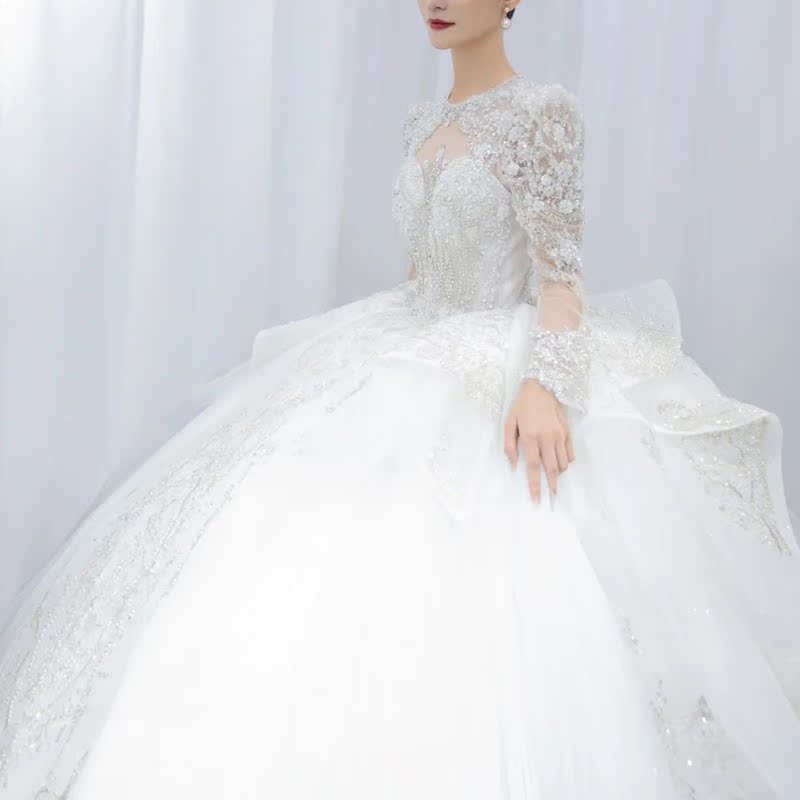 Main wedding dress 2021 new bride French big tail heavy industry luxury high-end court style Hepburn long-sleeved winter