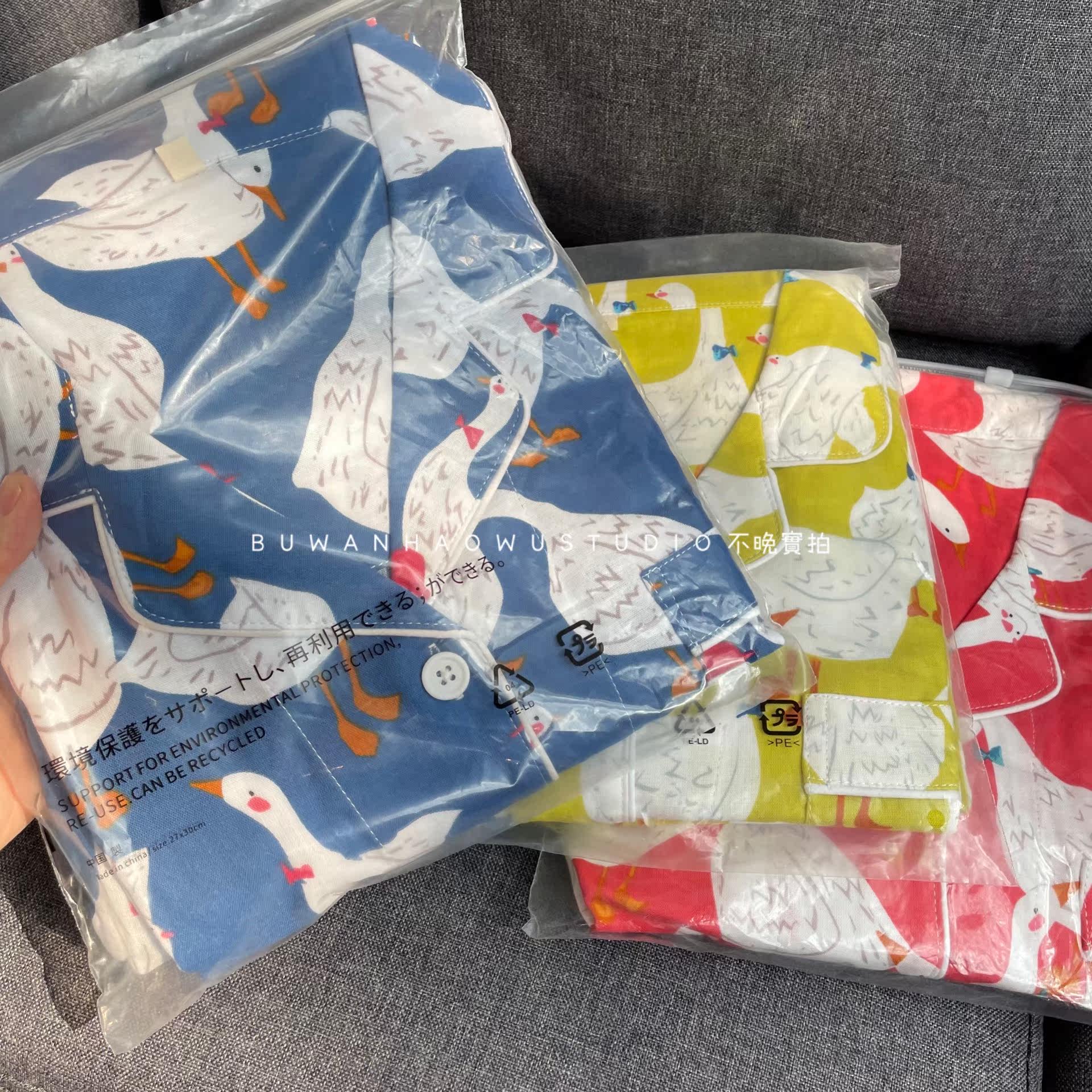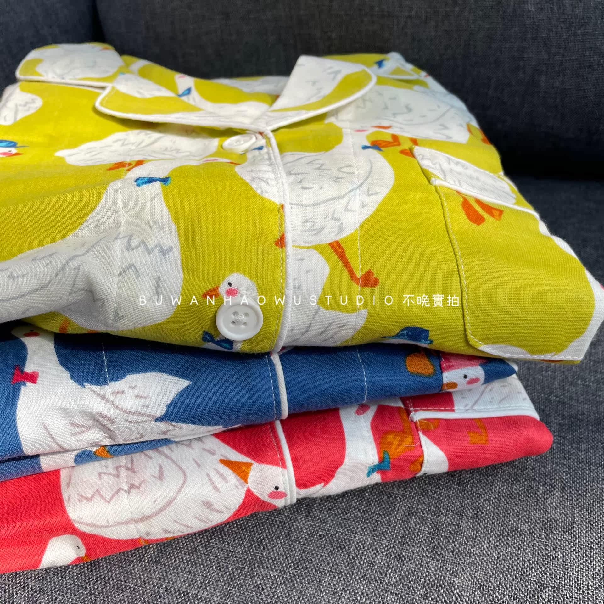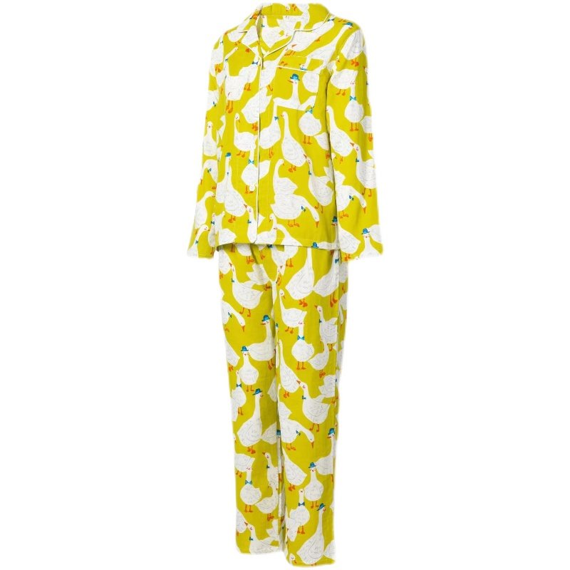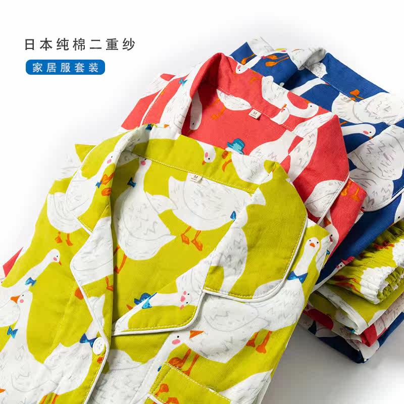 Export Day Single) Foreign Trade Pure Cotton Double Layer Gauze Spring Autumn Suit Cartoon Ducks Big Goose Turnover Collar Home Clothing Pajamas