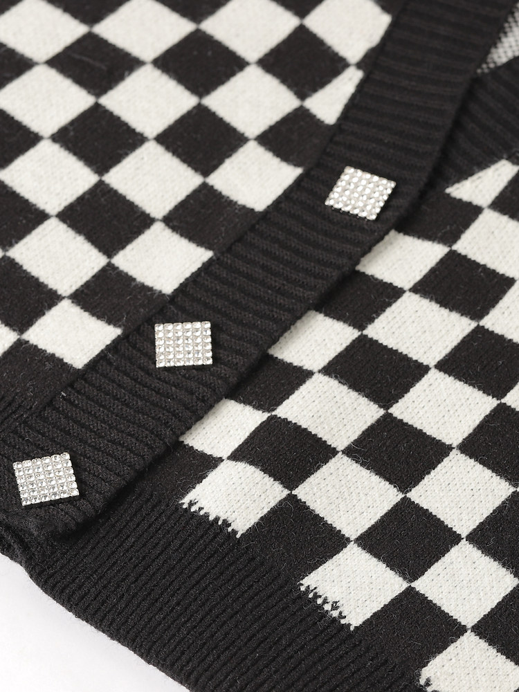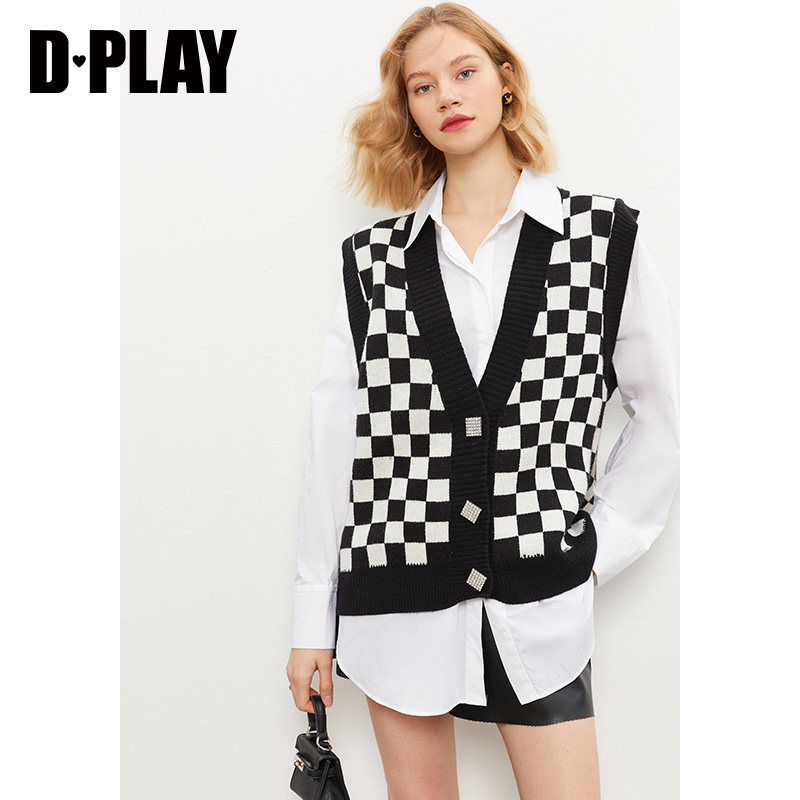 DPLAY2022 Years Summer New Ins Wind Black & White Collision CHECKERBOARD Knitted Cardiolor button to decorate the Machia