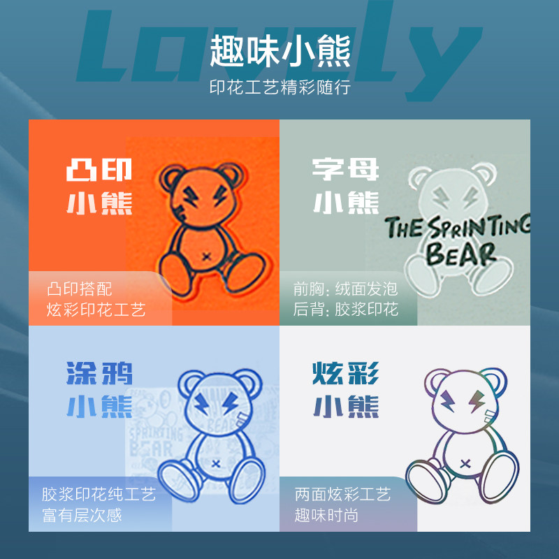 Black convex print Colorful Little Bear 37 Bleached Convex Print Dazzling Kumb 35 Deep Orange Convex Print Dazzling Kumb 36 Light Green Letters Small Bear 28 Backs Dazzling-black patterned 55 backs dazzling-Drizzle