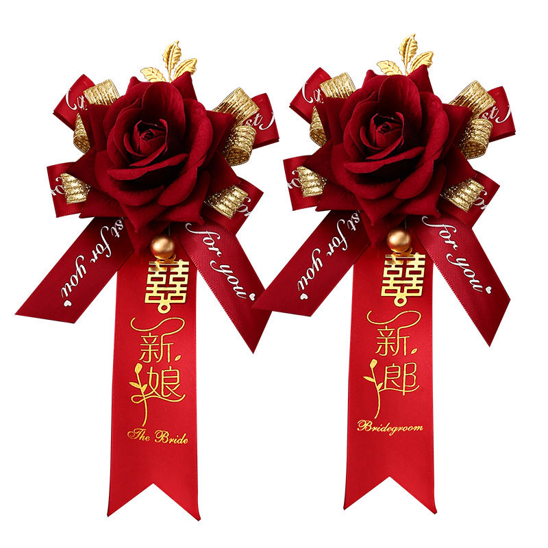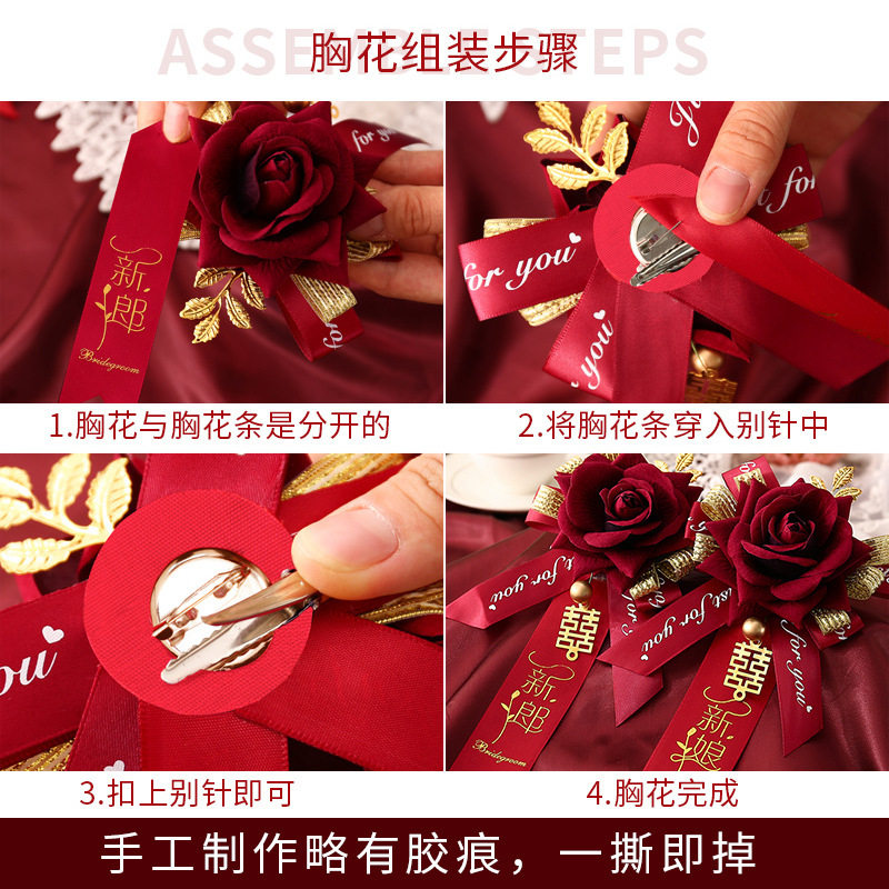 One wine red corsage (naked flower) one wine red corsage (optional title) one wine red (groom and bride) one pair wine red (best man and bridesmaid) one pair wine red (father and mother) one
