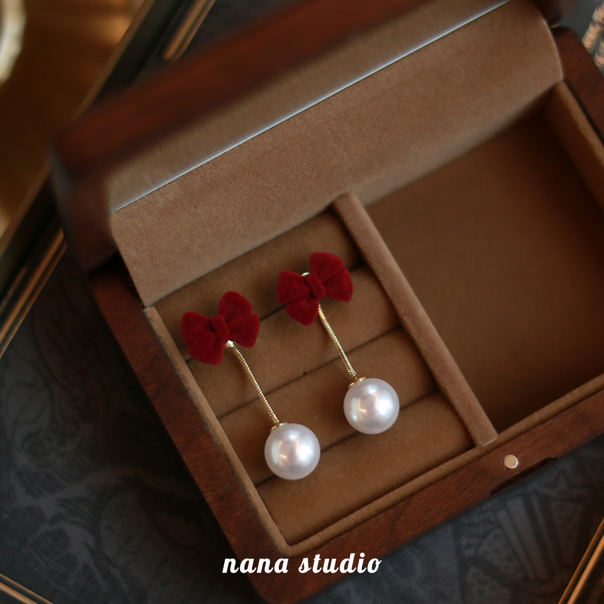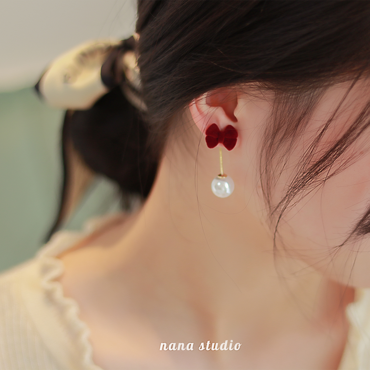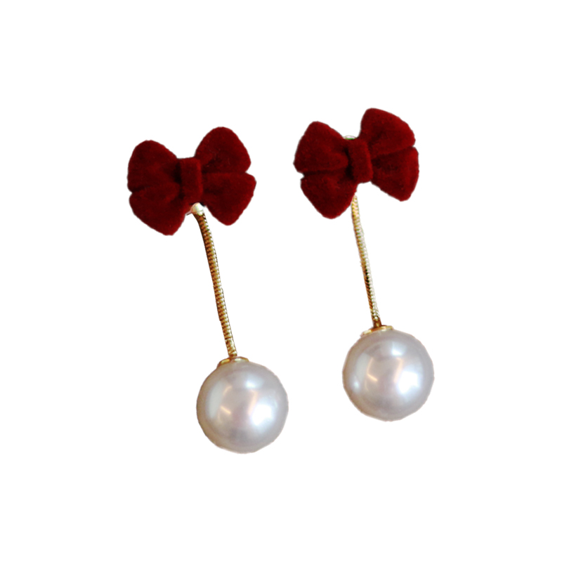 Pearl red velvet earrings earrings female 2021 new trendy high-end autumn and winter red bow New Year's earrings