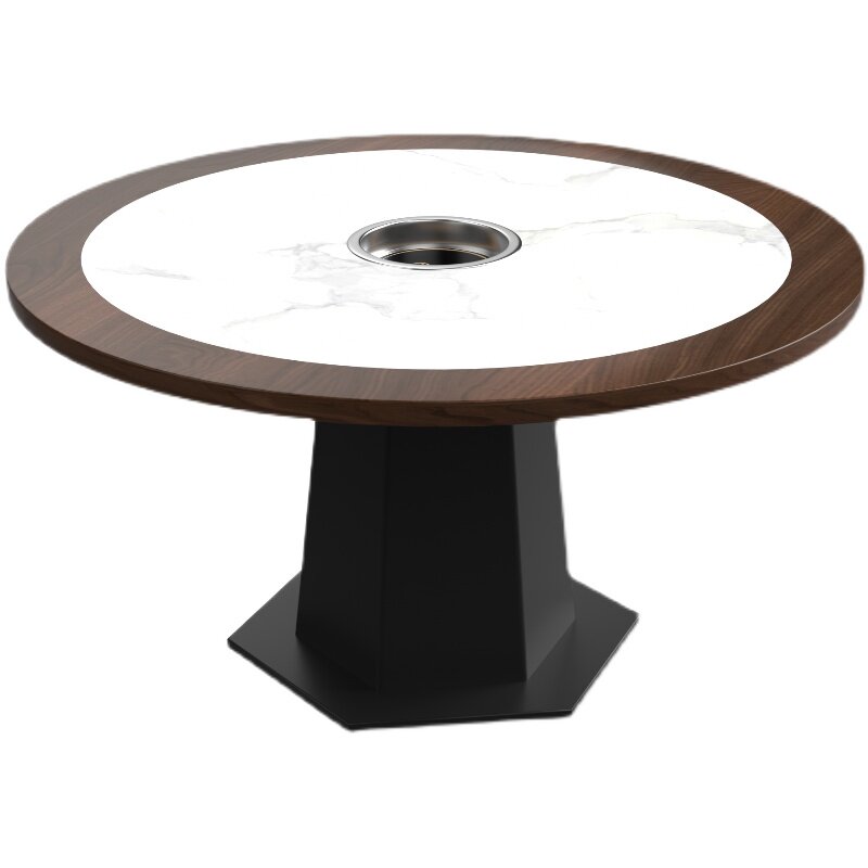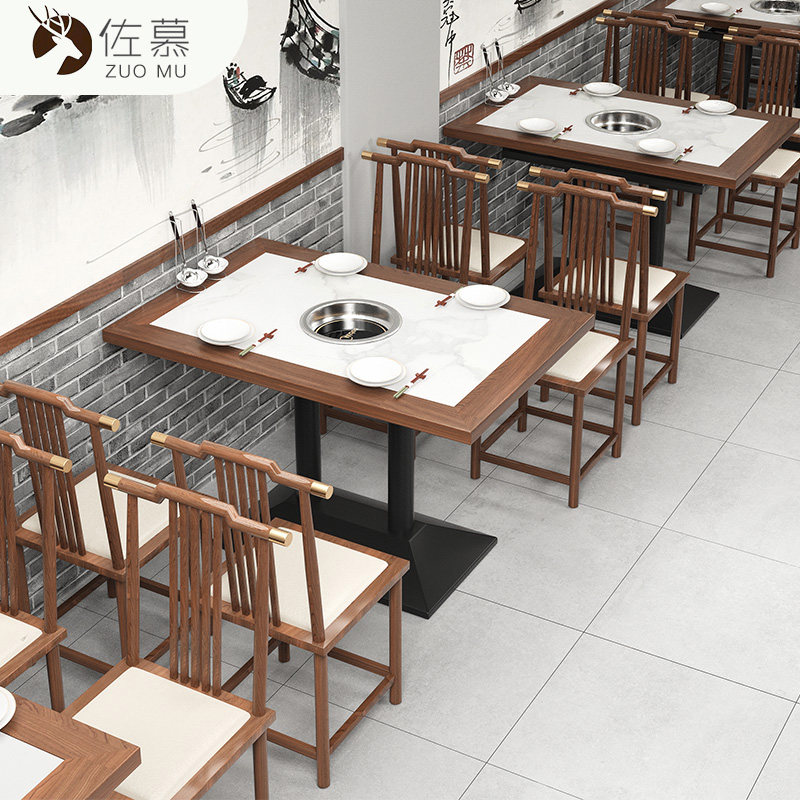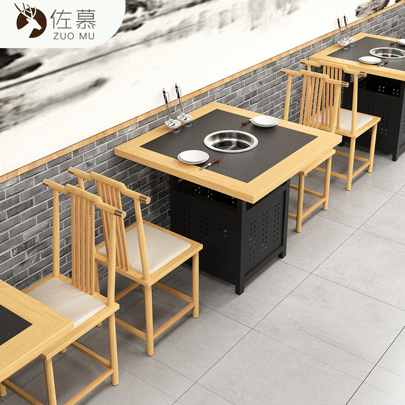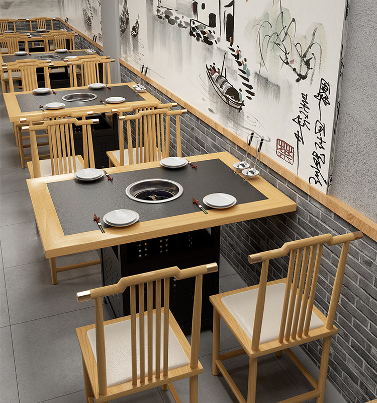 New Chinese style small vegetable garden restaurant dining table and chairs, fire stone solid wood edging, commercial hot pot table and induction cooker