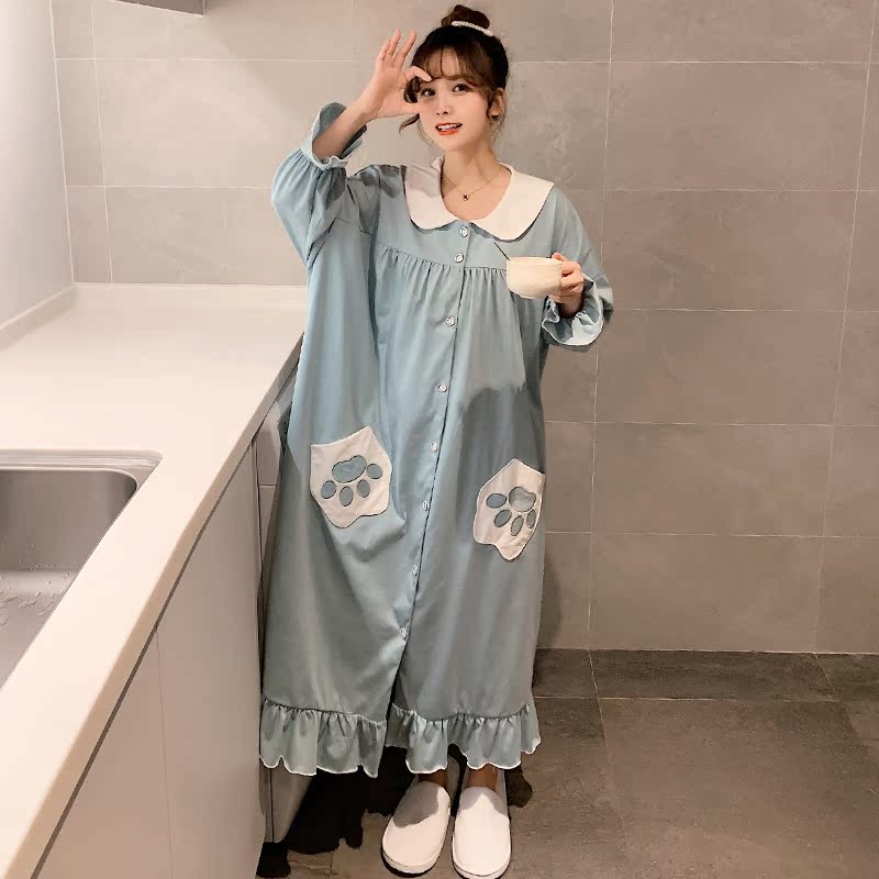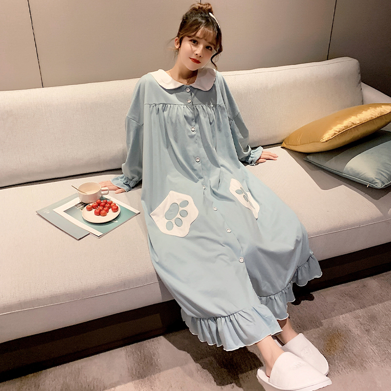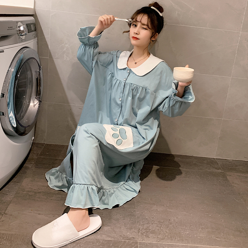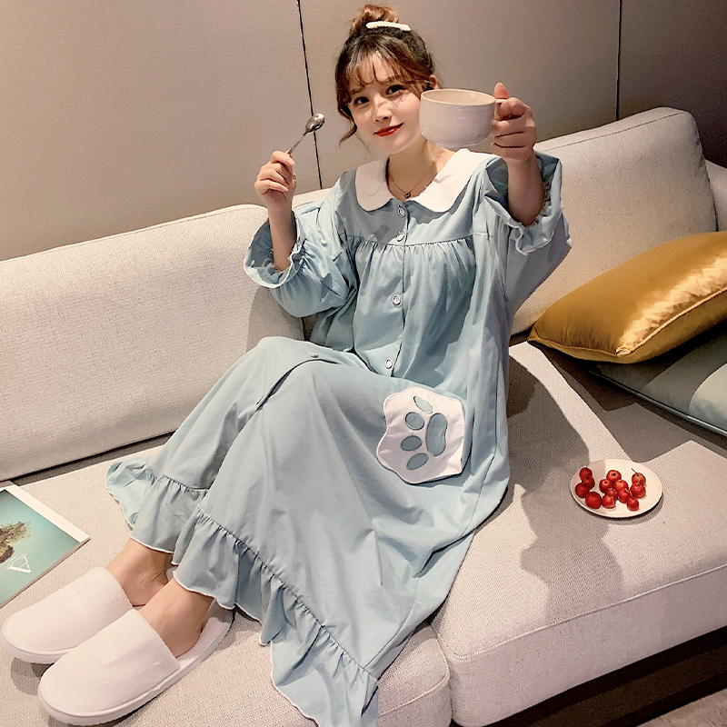 Sleeping Skirt Woman Spring Autumn Long Version Pure Cotton Long Sleeve 2022 New Pregnant Woman Cute Internet Red Mist Blue Shirt Collar Pyjamas Dress