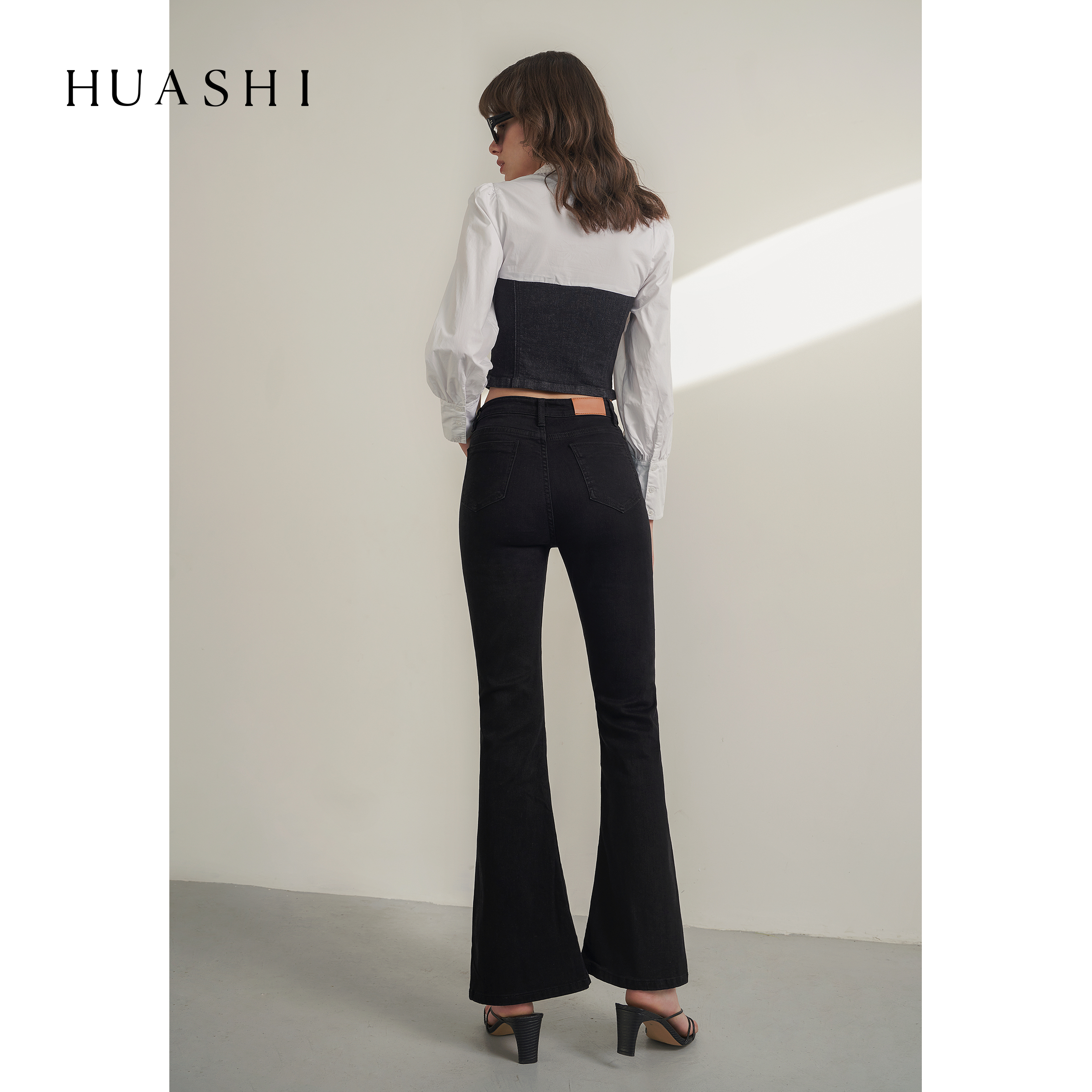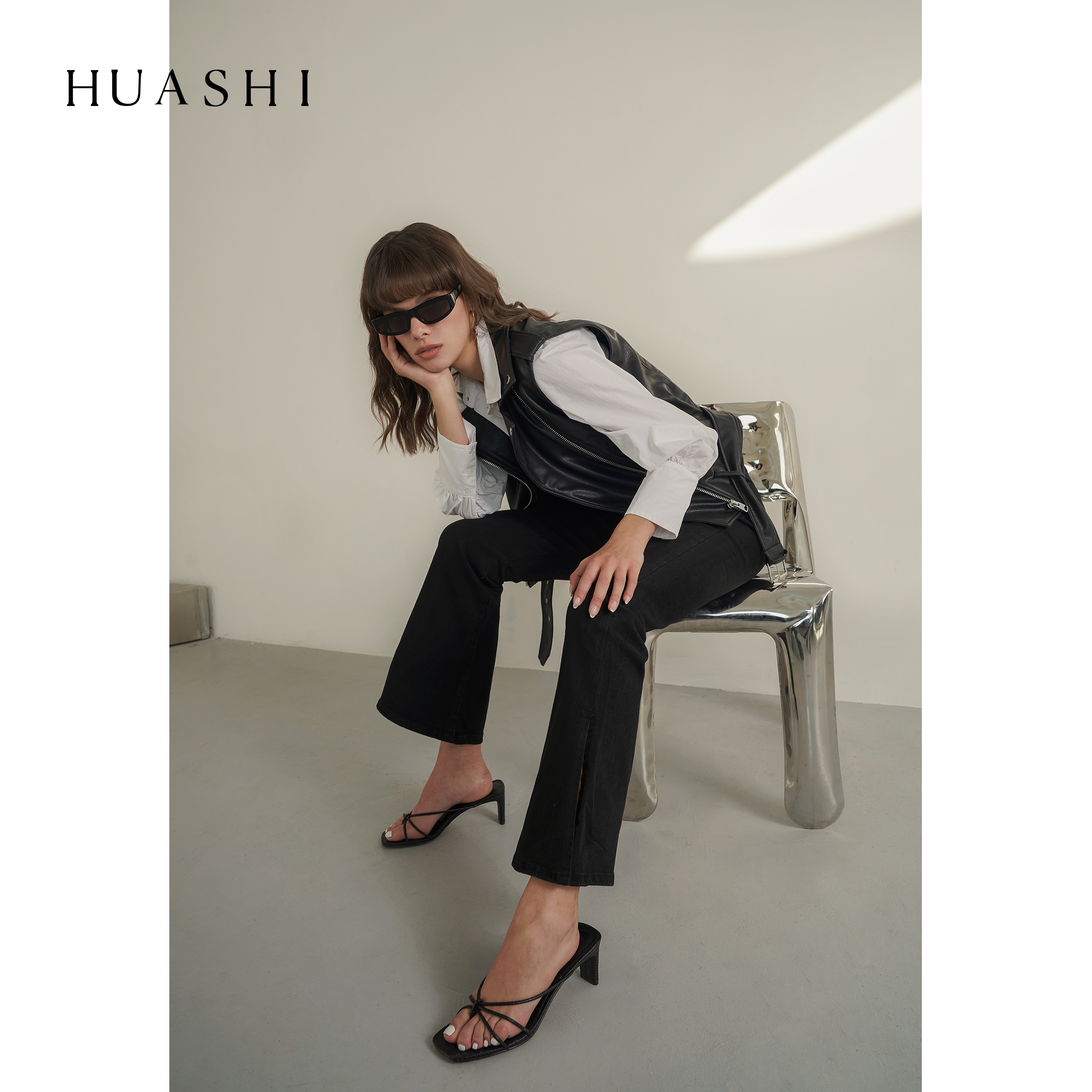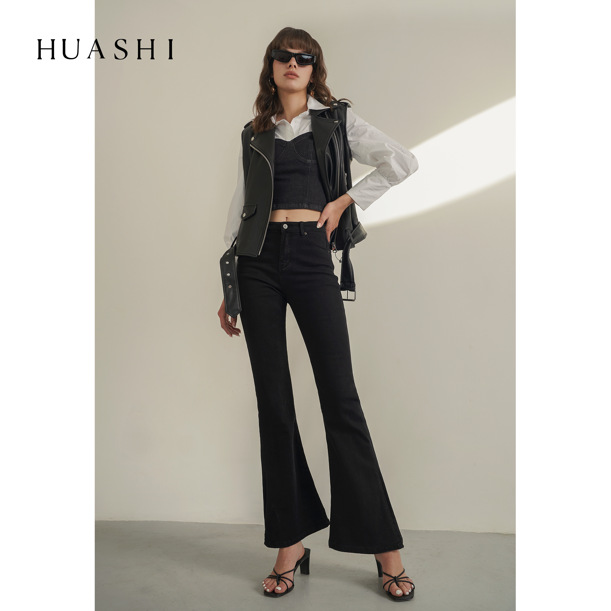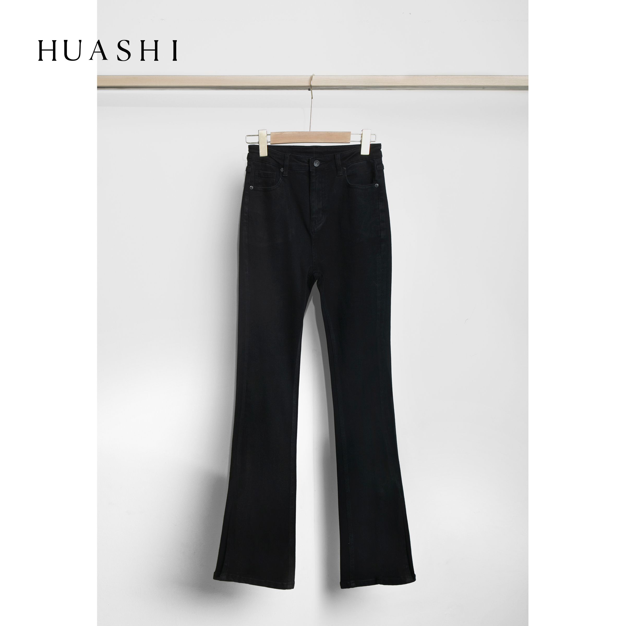 HUASHI HIGH QUALITY BLACK OPEN FORK MICROLAGINE PANTS WOMAN HIGH WAIST AND SLIM DESIGN SENSATION HORN LONG PANTS