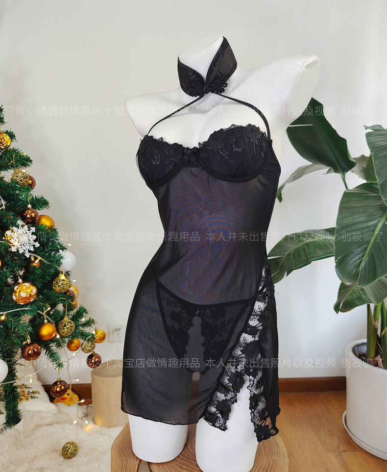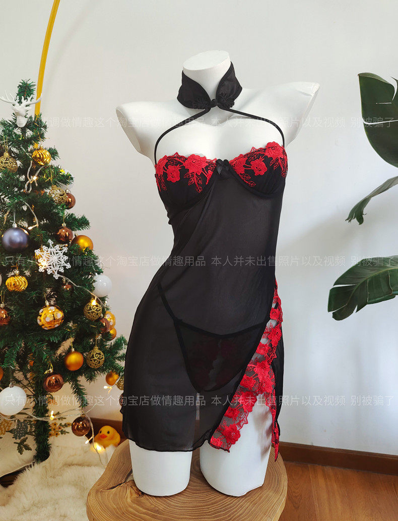Classical private room cosplay rose embroidery hanging neck slit see-through mesh backless cheongsam dress suit
