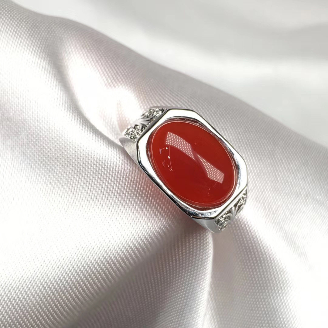 Red jade marrow male ring 925 silver inlaid green gem ice - grade ring of green - mouth men's gift