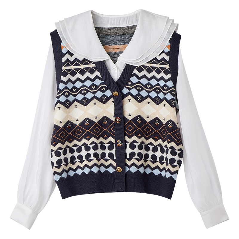 Xiangying fake two knitwear women 2022 new fashion doll collar shirt diamond checker sweater early spring patch top
