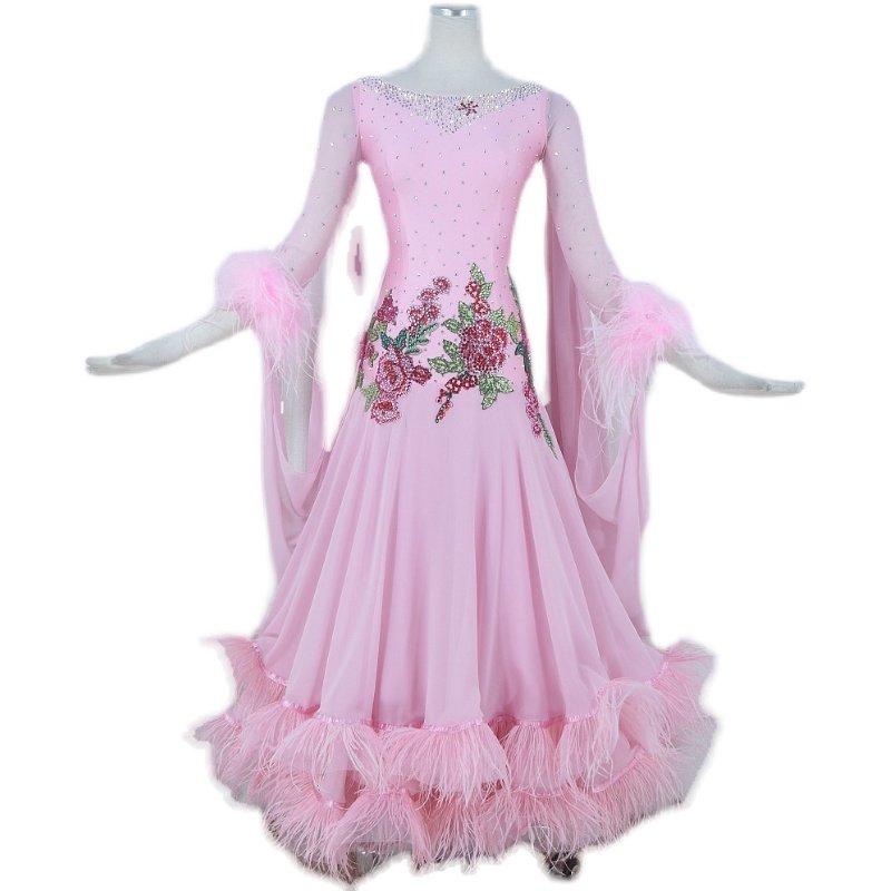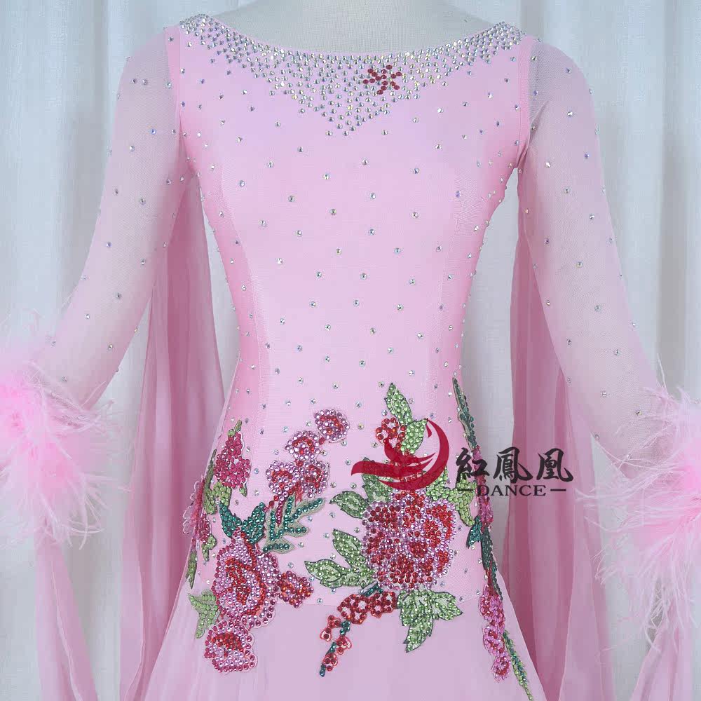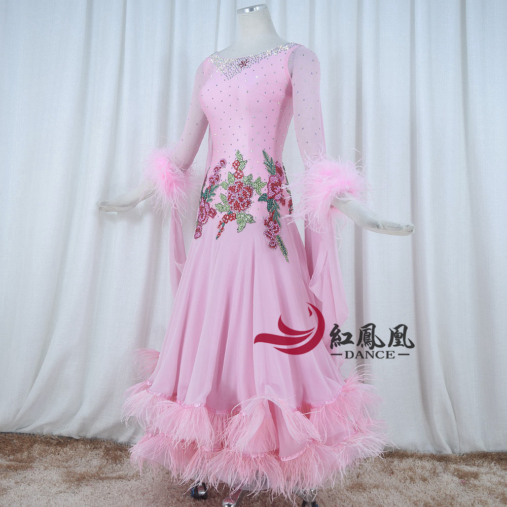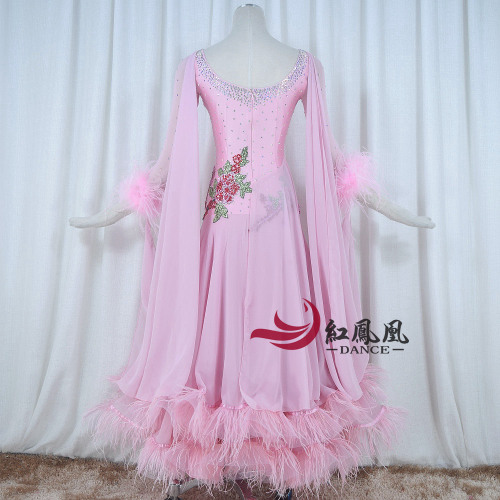 Red Phoenix Pink Ostrich Wool's Morden Dance Competition Skirt National Waltz Tango Fox Walk Performance Suit 1020