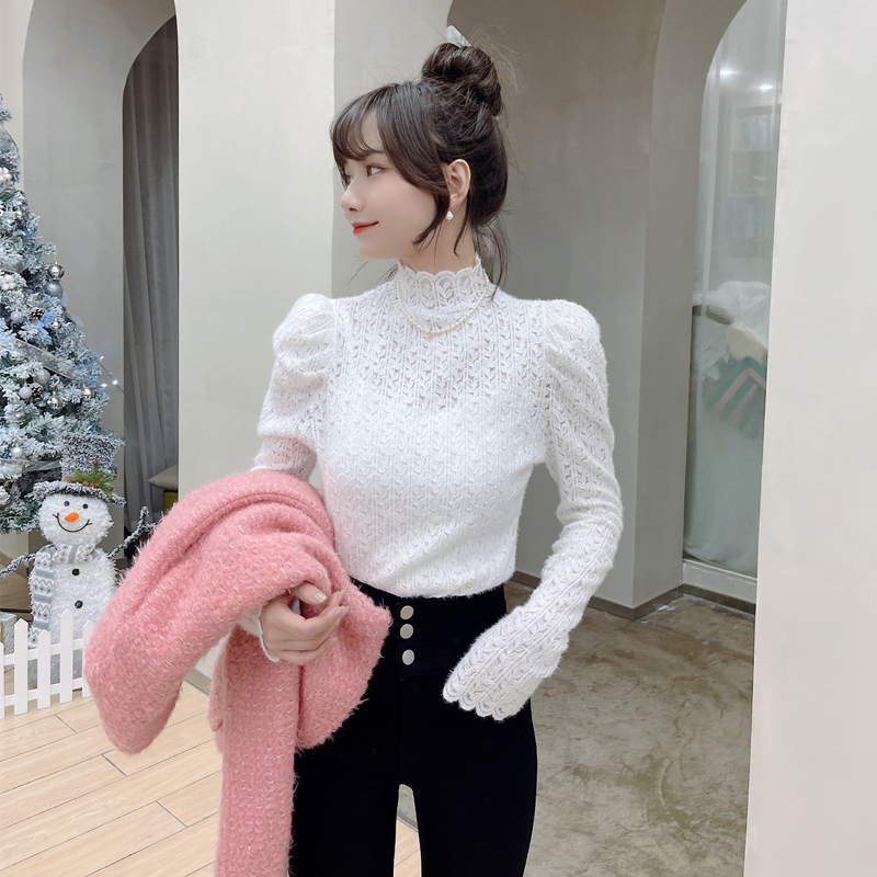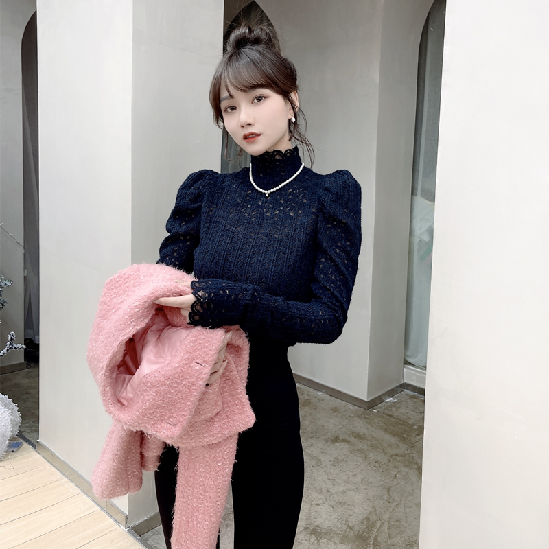 JUSCC Card Female dress Official flagship Korean version High collar tea will name Yuanyuan Hollowed-out Lace Blouse Girl Net Red the same