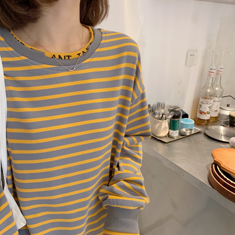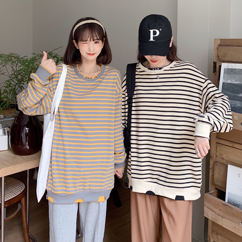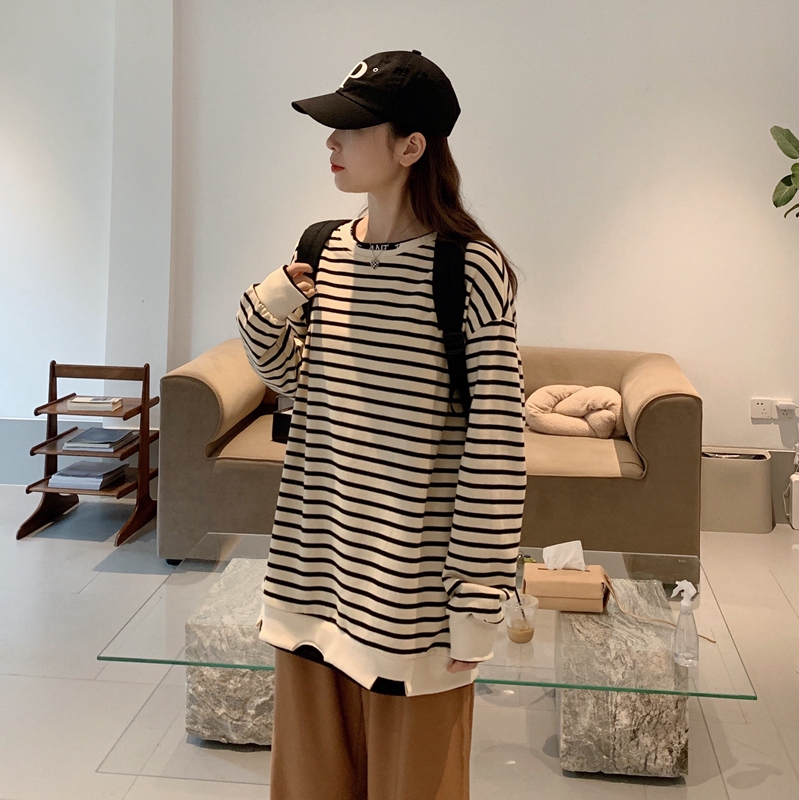 Large size Pregnancy Woman Dress Spring Autumn Dress Long Sleeve Blouse 200 Catty Striped T-shirt Loose and Lean Splicing Fake two-piece Clothing Tide