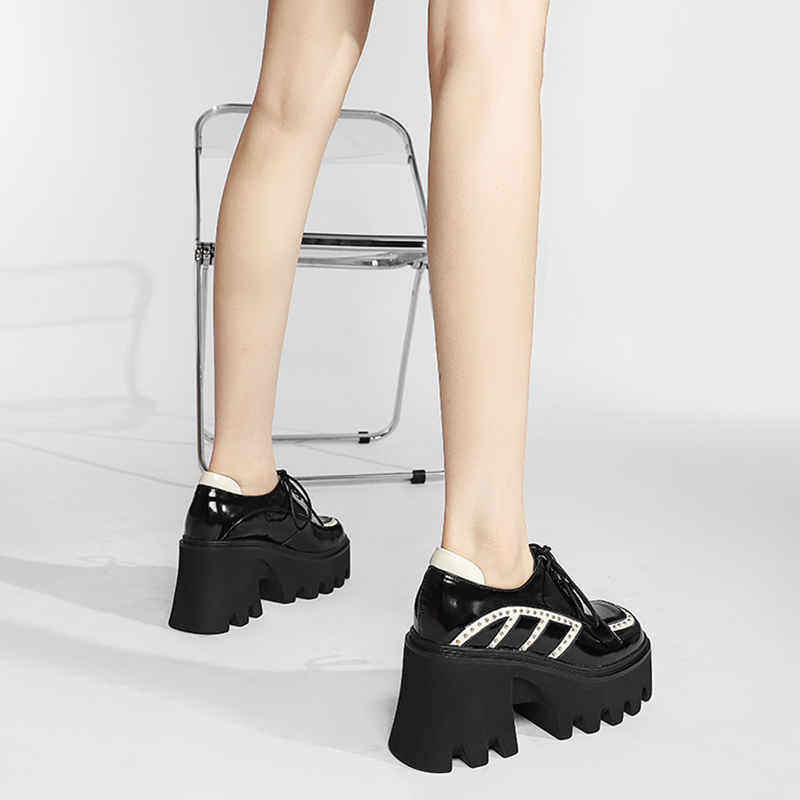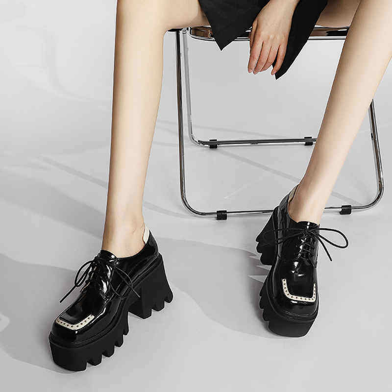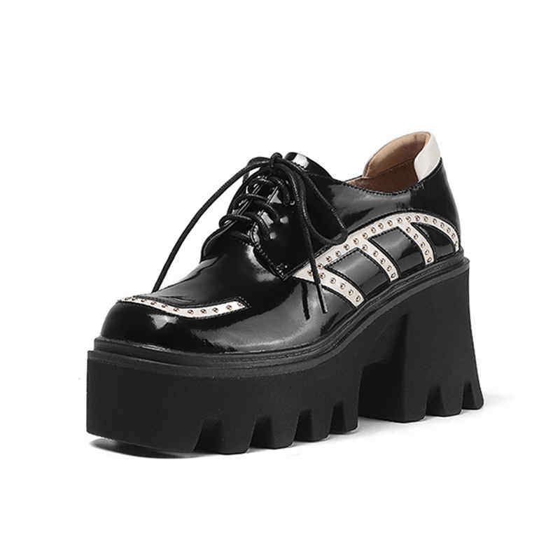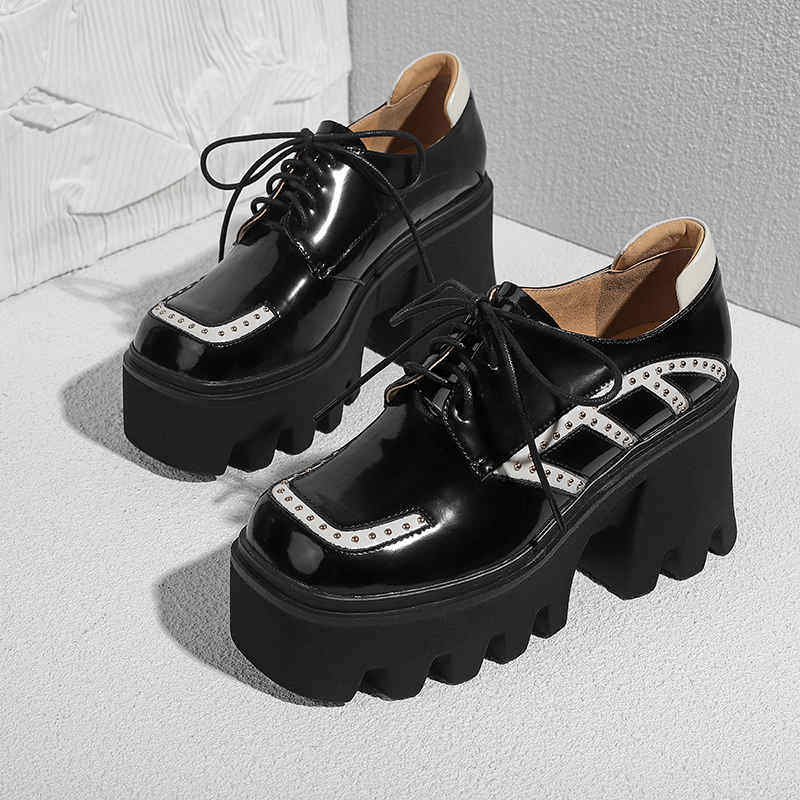 (Xiao Tingmei) thick-soled bag shoes, women's small, thick-heeled platform shoes, high-heeled color-blocking British style lace-up shoes