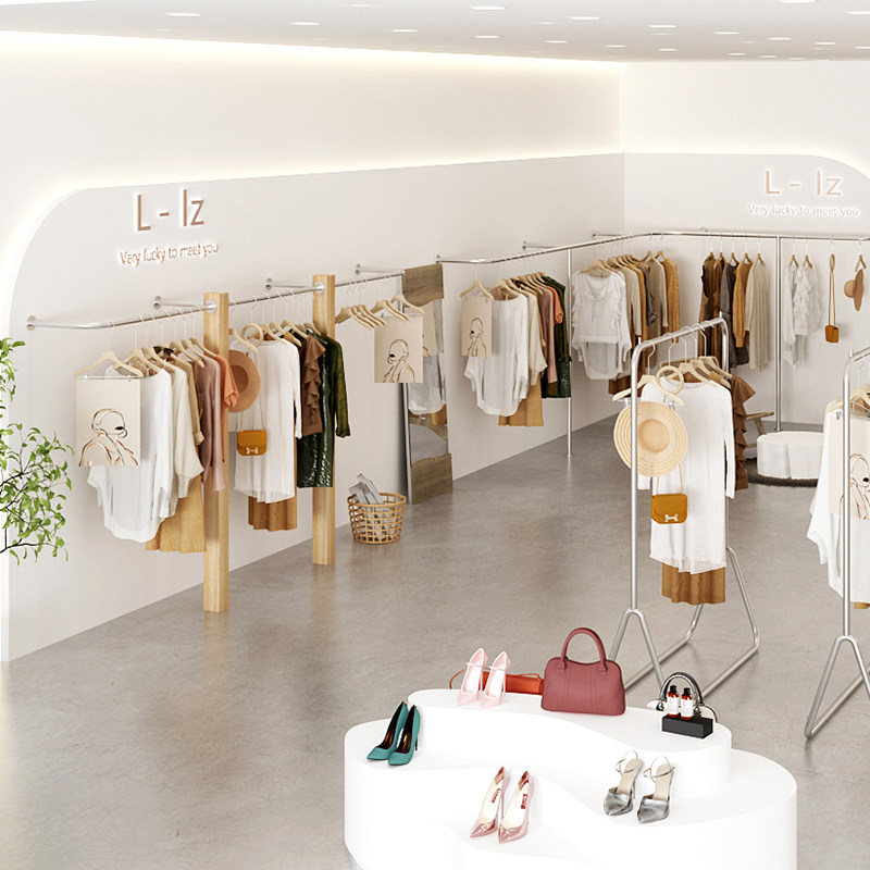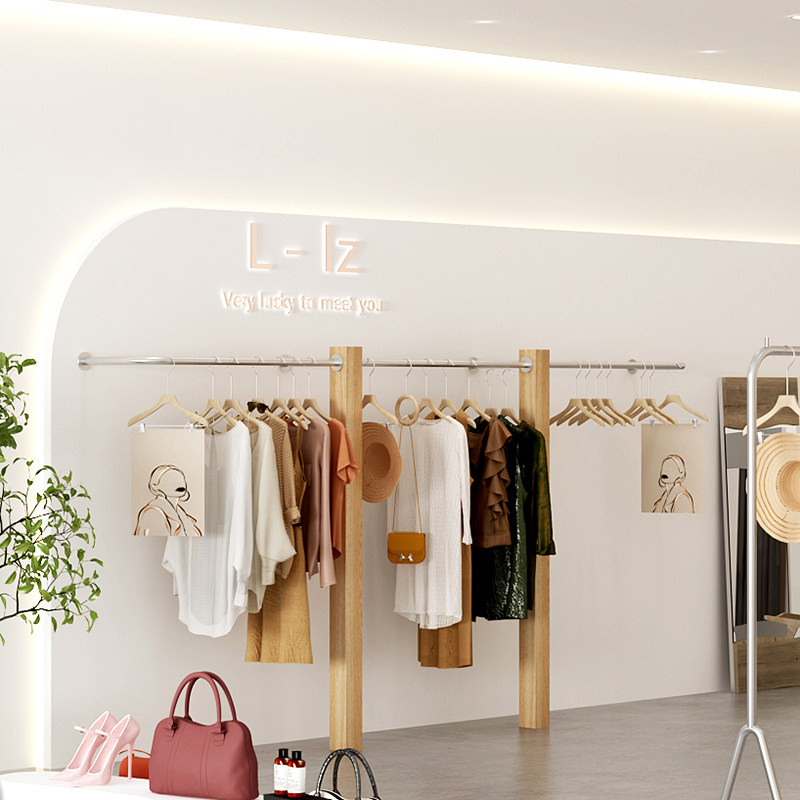 Women's store shelves display shelves children's clothing store display shelves solid wood log clothing display store hanging rack