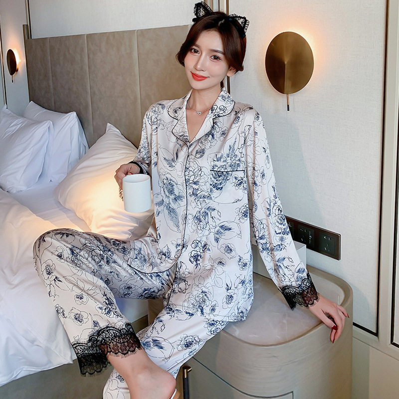 Spring and autumn ice silk pajamas ladies long-sleeved simple homewear suit 2021 new Korean version large size can be worn outside