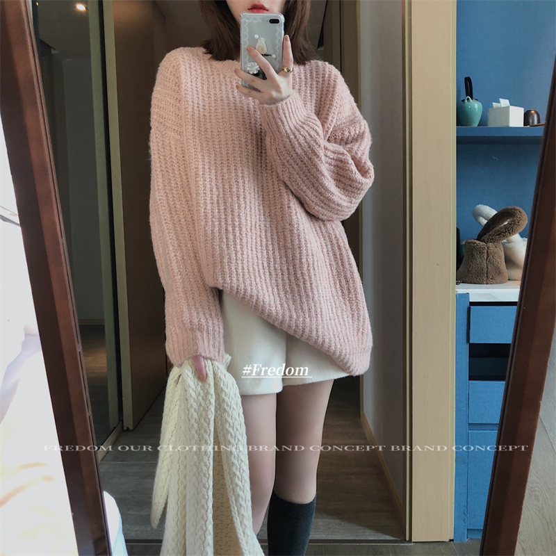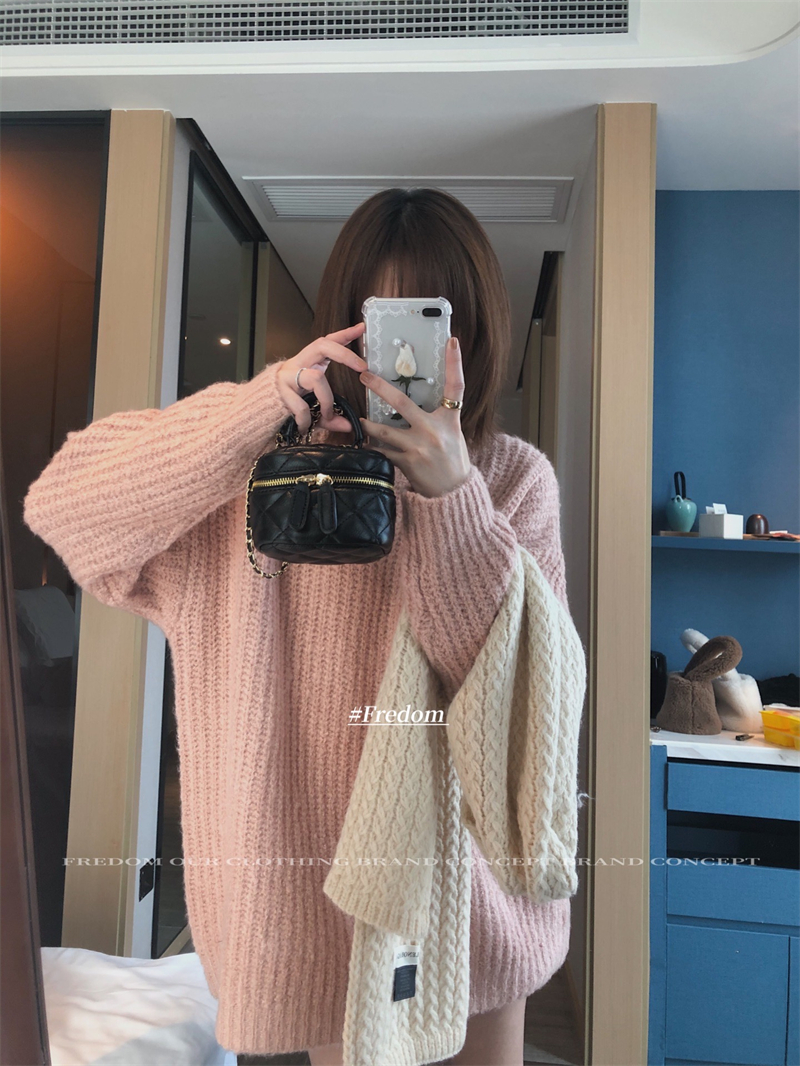 METWO Bottom Missing Pink Sweater Winter Women's 2021 New Mid-length Lazy Loose Niche Tops