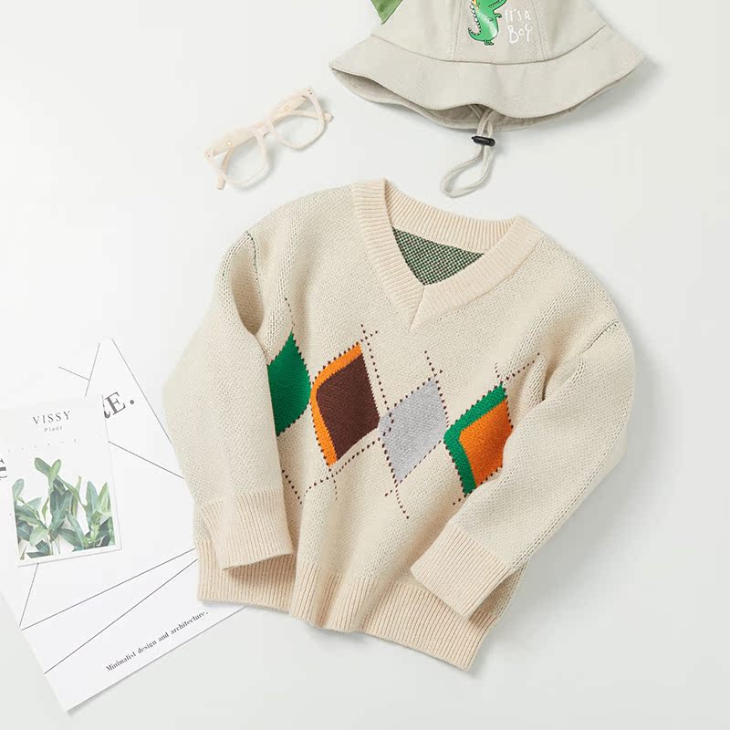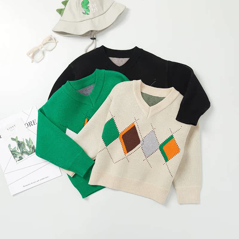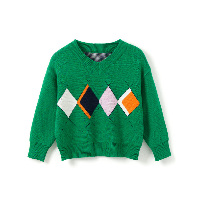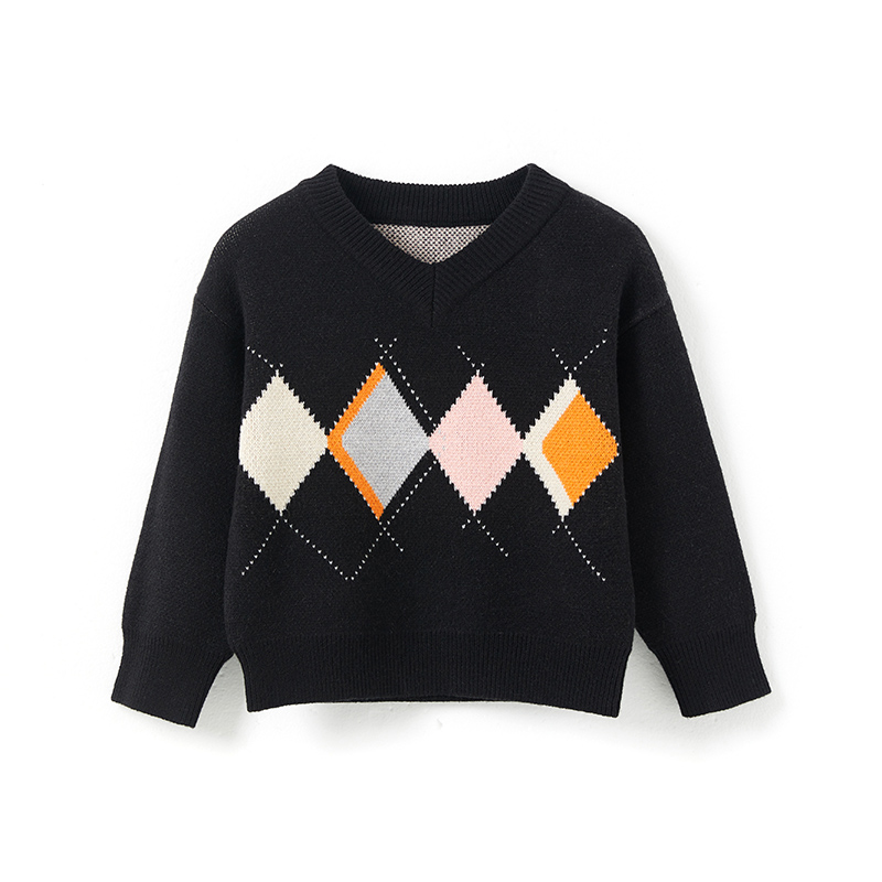 K sister children's clothing contrast color diamond V-neck sweater core spun yarn round neck casual all-match children's sweater