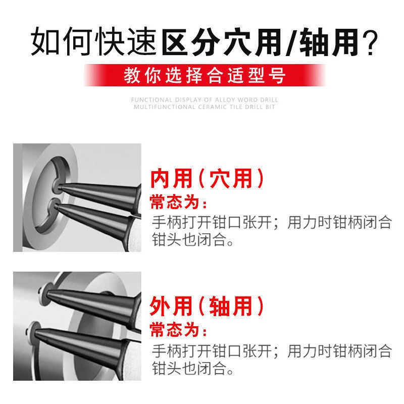 Industrial grade (5 inch circlip pliers) straight inside and outside straight Industrial grades (circlip pliers 5 inches) Bending inside and outside bending all industrial grades (circlip pliers 7 inches) straight inside and straight outside all industrial grades (circlip pliers 7 inches) ) inwardly curved and outwardly curved each