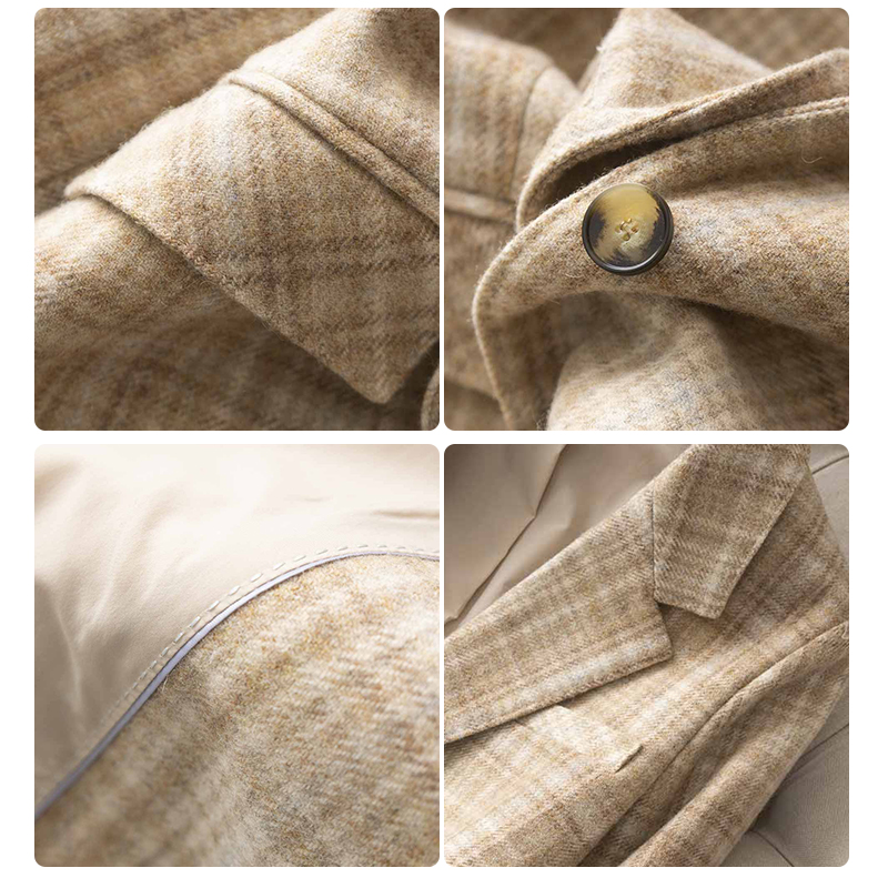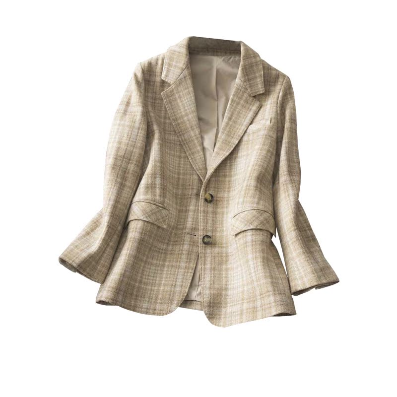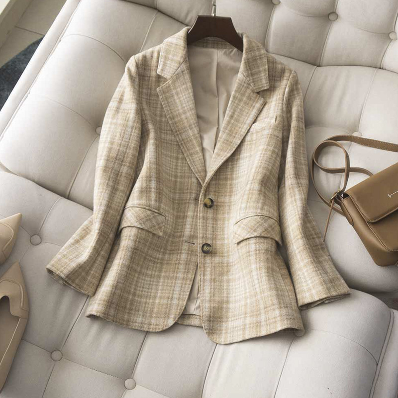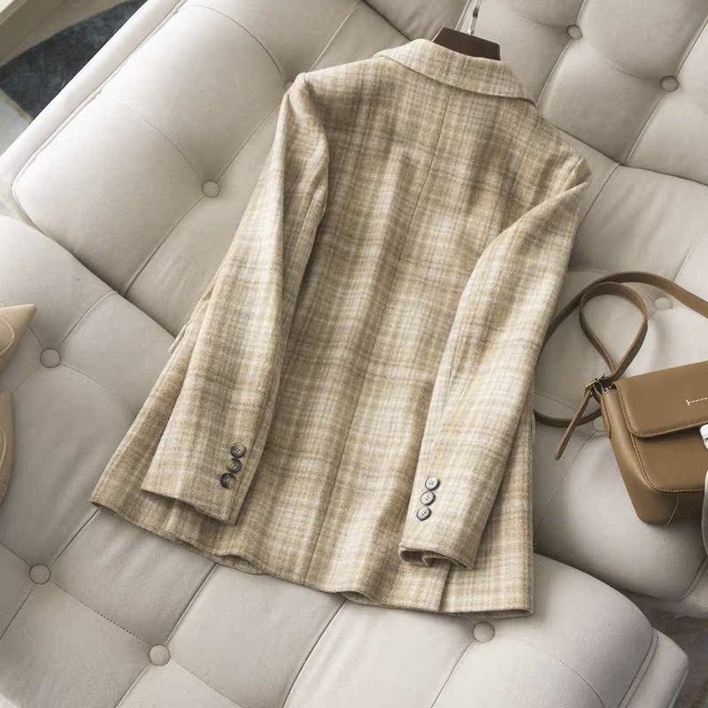 Velvet moss British temperament Wool yarn-dyed contrast color plaid two-button suit Micro-wide version Ladies suit