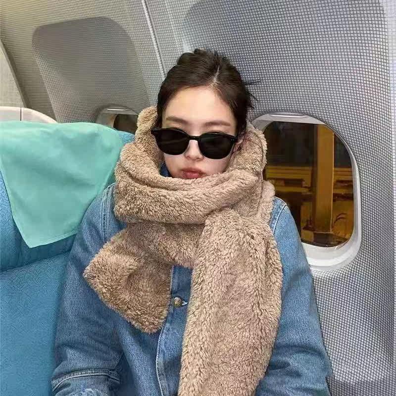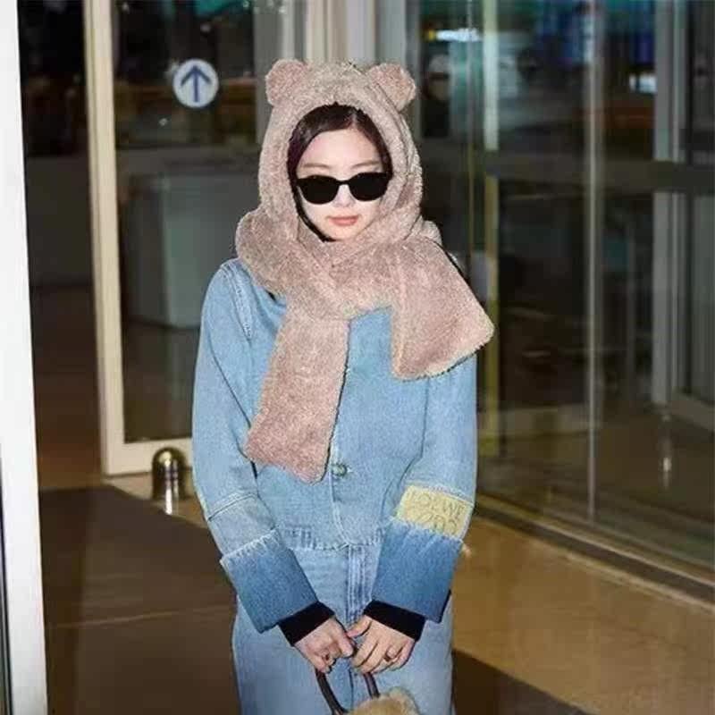 Japanese Jennie with the same bear hat, scarf and gloves all-in-one women's winter thickened warm plush scarf