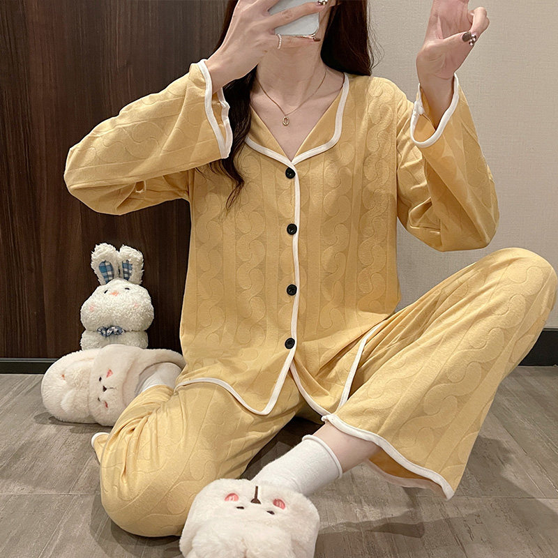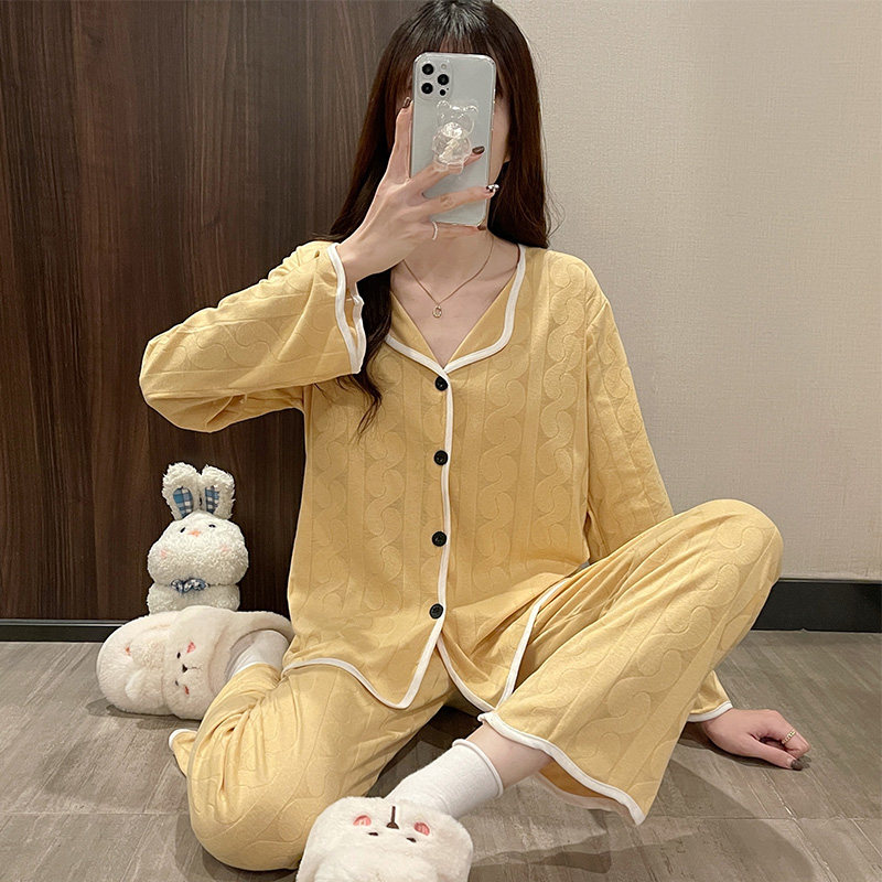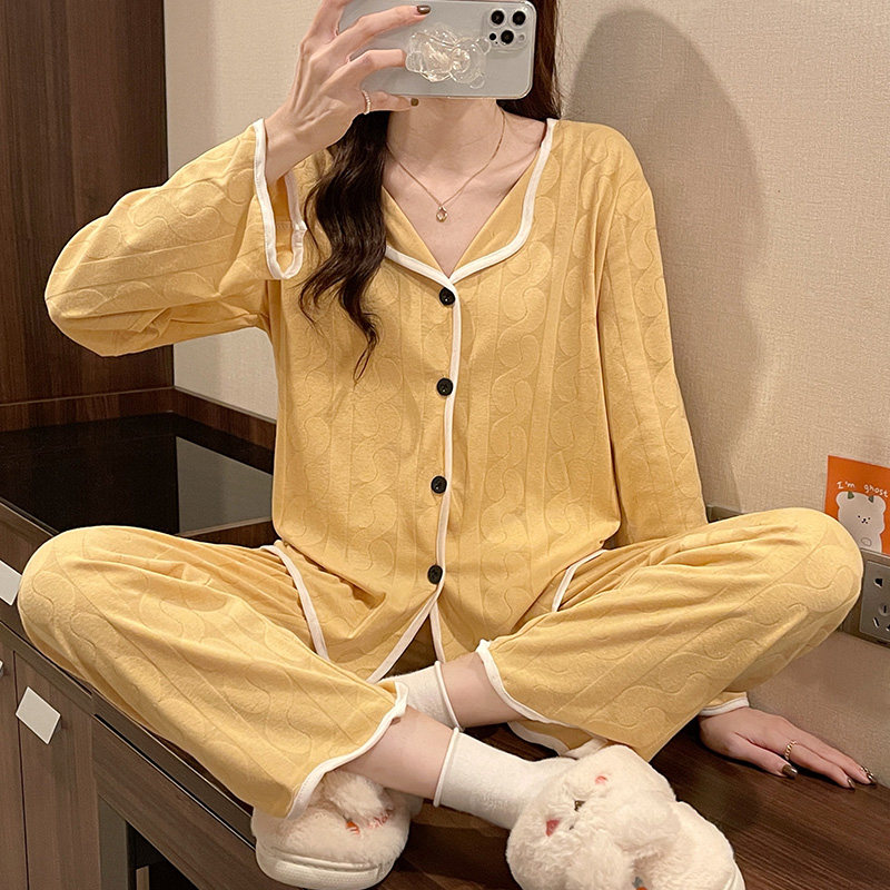 Sleepwear Girl Spring Autumn Pure Cotton New 2021 Long Sleeve Net Red Popcorn Autumn Winter Home Cuddly Suit Yellow