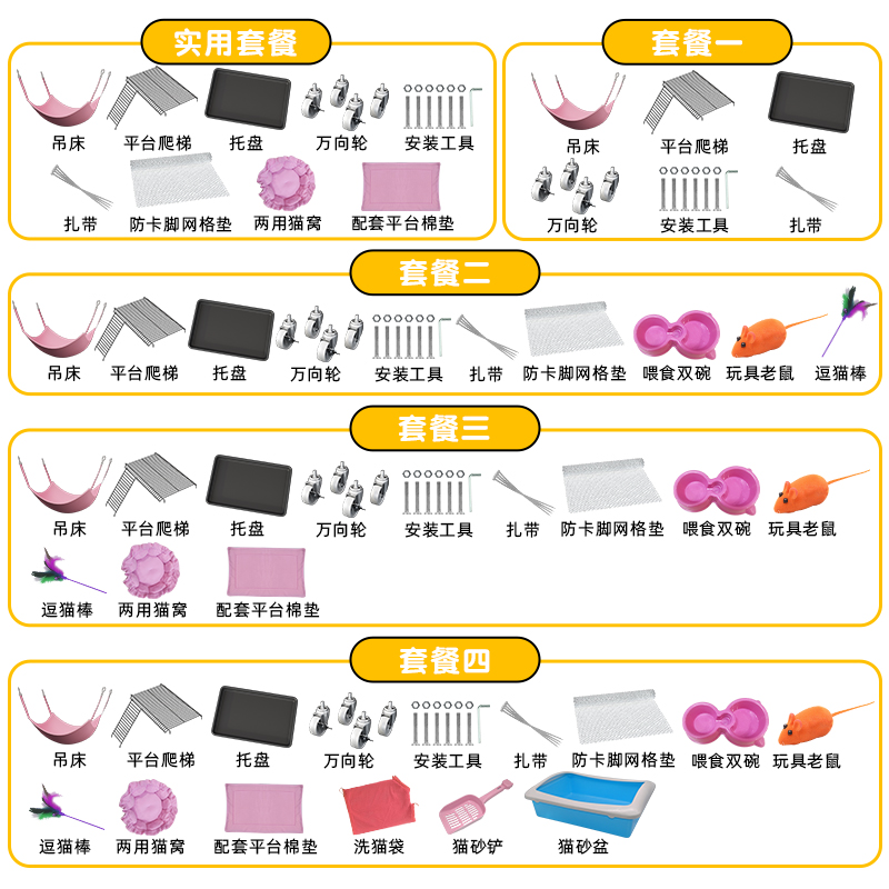 Package 1 (buy 1 get 6 basic models), practical package 1, foot mat, platform mat, nest package 2 (buy 1 get 10 free play package) package 3 (platform mat, pumpkin nest) package 4 (wash cats)