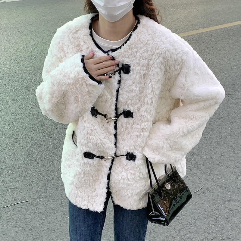 2022 Korean version of lamb wool coat women's winter plush warm fur one imitation rabbit hair horn button top