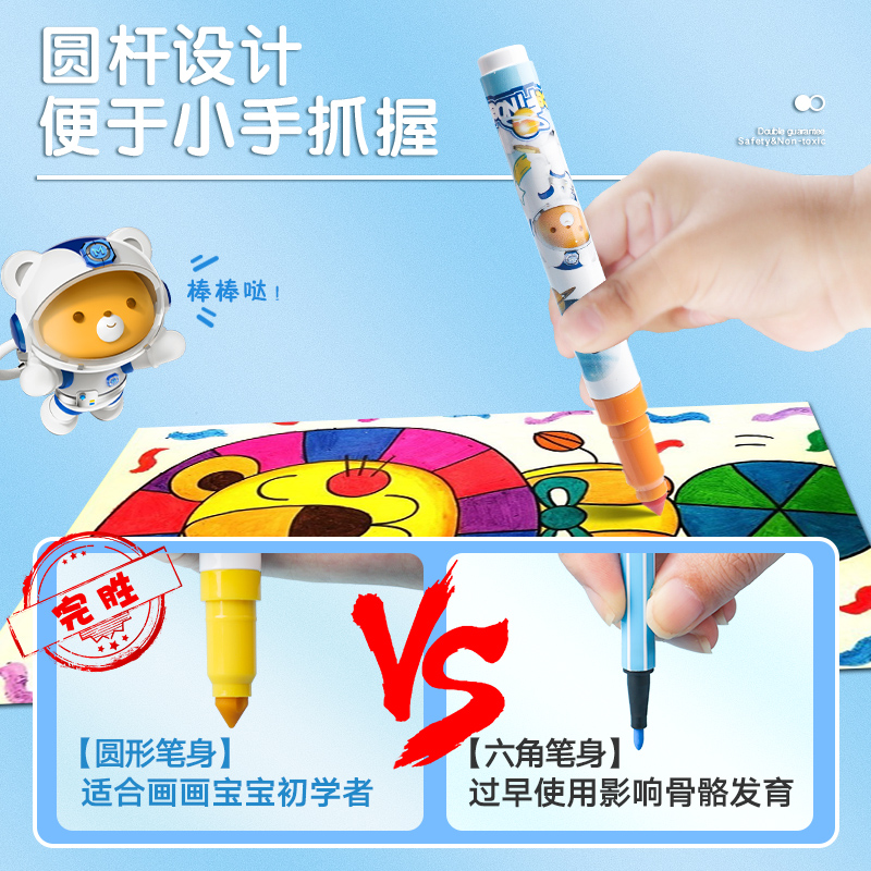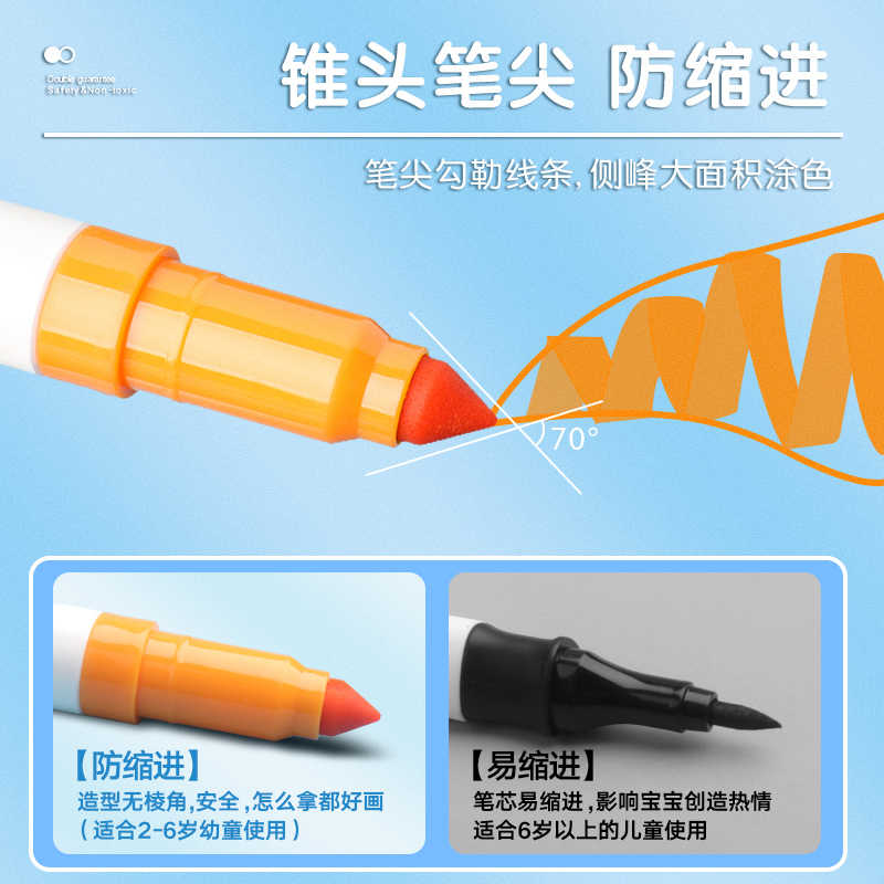 Safe and non-toxic (1-2 year old recommended round head 2 years old recommended cone head) Fresh food grade cone head water color pen coated color outline good performance of food grade (cone head 12 color) food grade