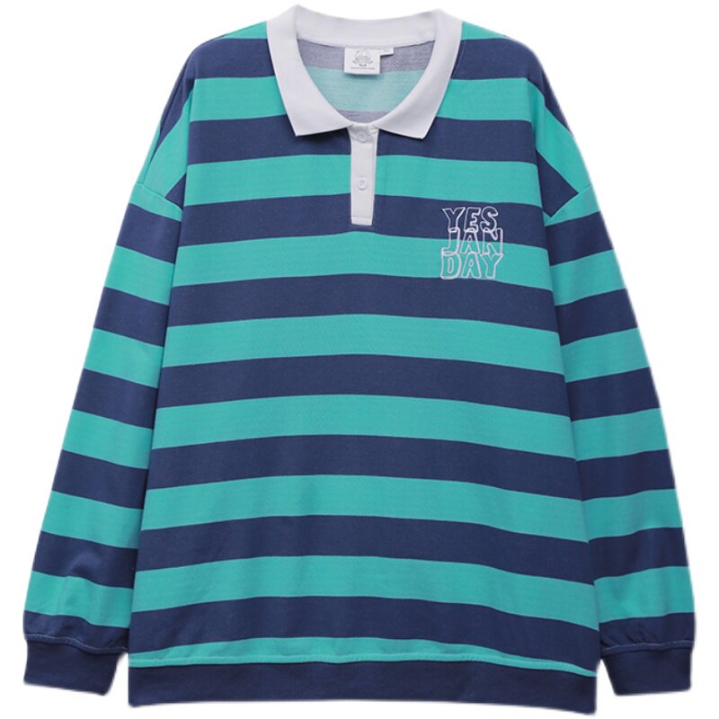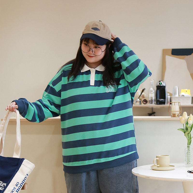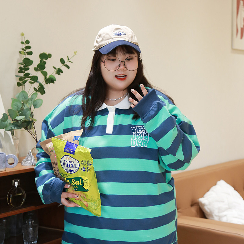 YUZI caviar large size ladies striped casual top 2022 spring new fat MM contrast color POLO collar vitality top