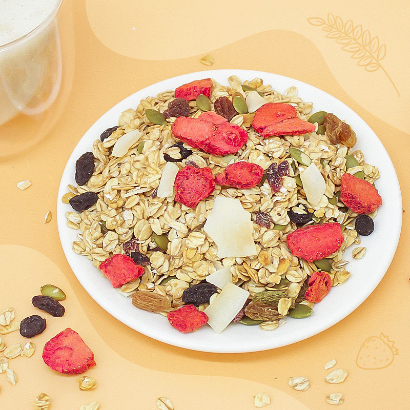 oat,Oatmeal Chia Seeds Pumpkin Seeds Roasted Coconut Flakes Dried Cranberries Freeze Dried Strawberries Red Raisins Green Raisins Blueberries Dried Stevia Powder Coconut Flour Honey Cinnamon Powder Skimmed Milk Powder Fructo-oligosaccharides (Little Green Can)