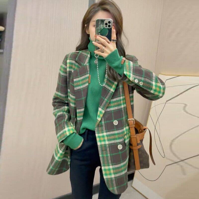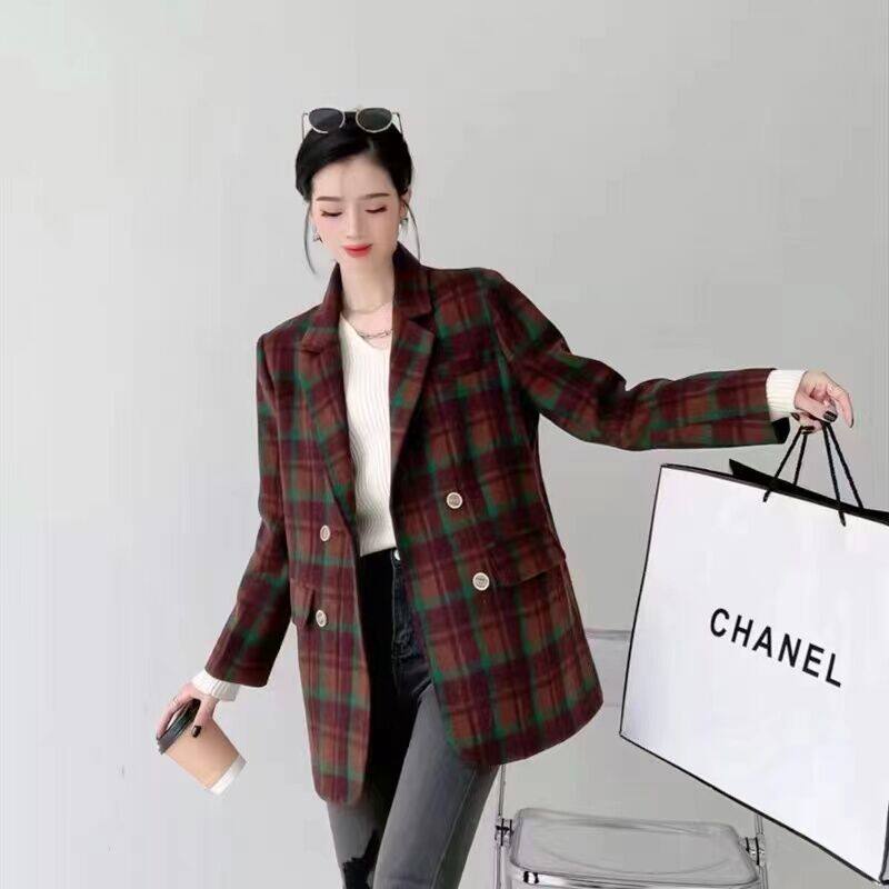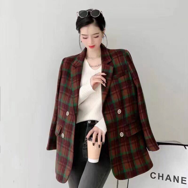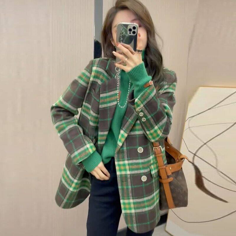 Plaid double face cashmere big coat woman medium long version 2021 Winter new stylish double-row buttoned with small fur coat