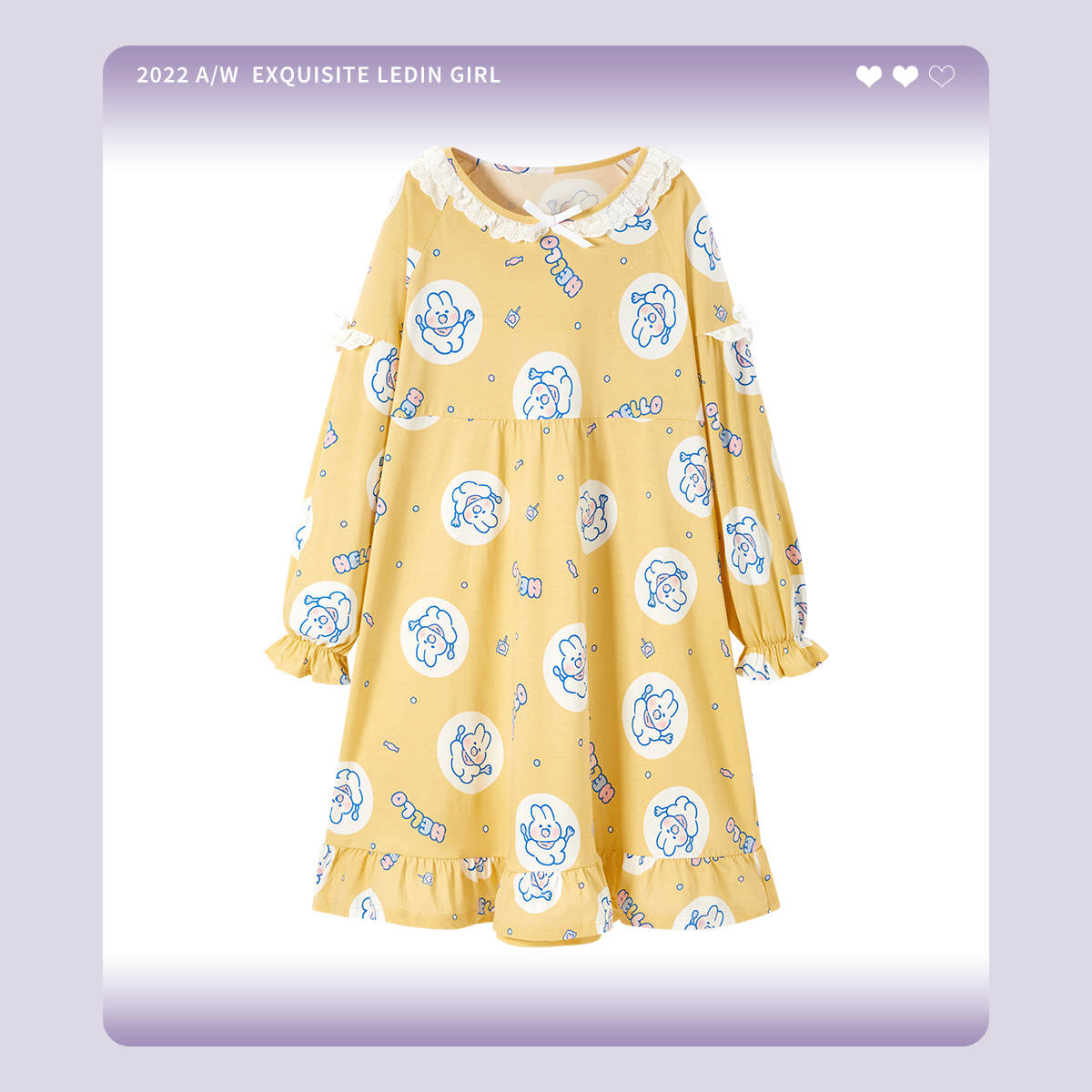 Lemachi Soft Cute Rabbit Joint Sleepwear Spring Autumn Long Sleeve Pure Cotton Sleeping Skirt Girl's Home Home Clothing Cartoon Extractable Dress Foreign Dress