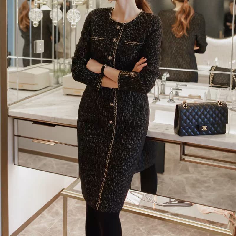 Single row of buckle small fragrant wind wool What to do with women's clothes Winter new long sleeves Long skirts commuter OL Korea
