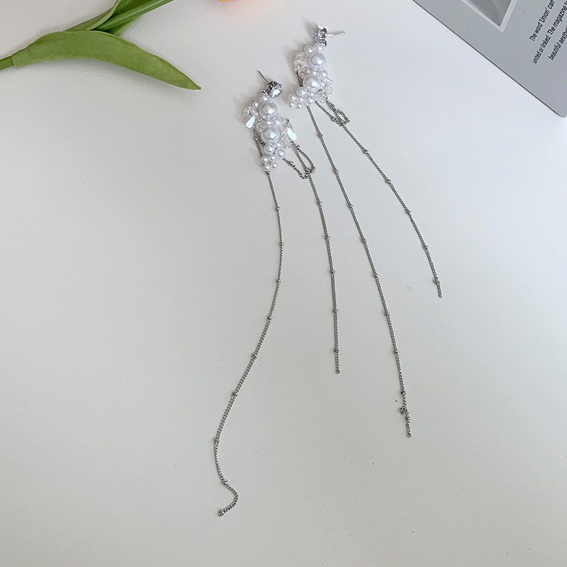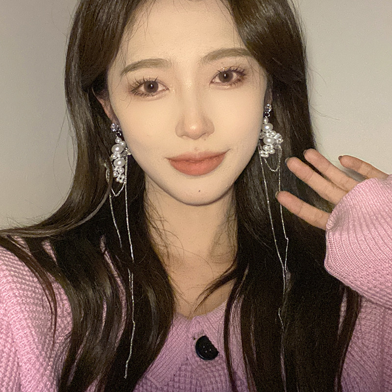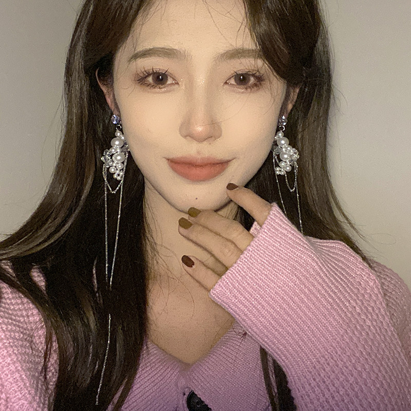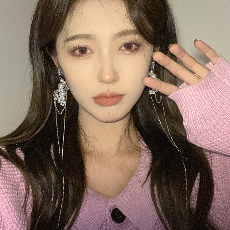 Pearl tassel earrings exaggerated high-grade long tassel face thin ear needles cold wind light luxury temperament ear accessories