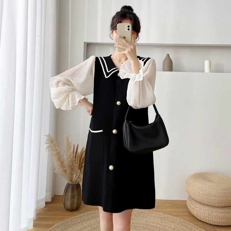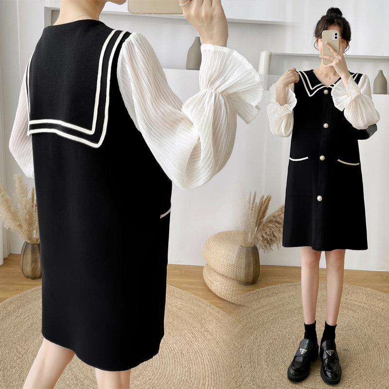 Gestational dress Spring loaded with new Korean version of the long version of the dress code foreign style Fashion Long Sleeve Fake two spliced dresses