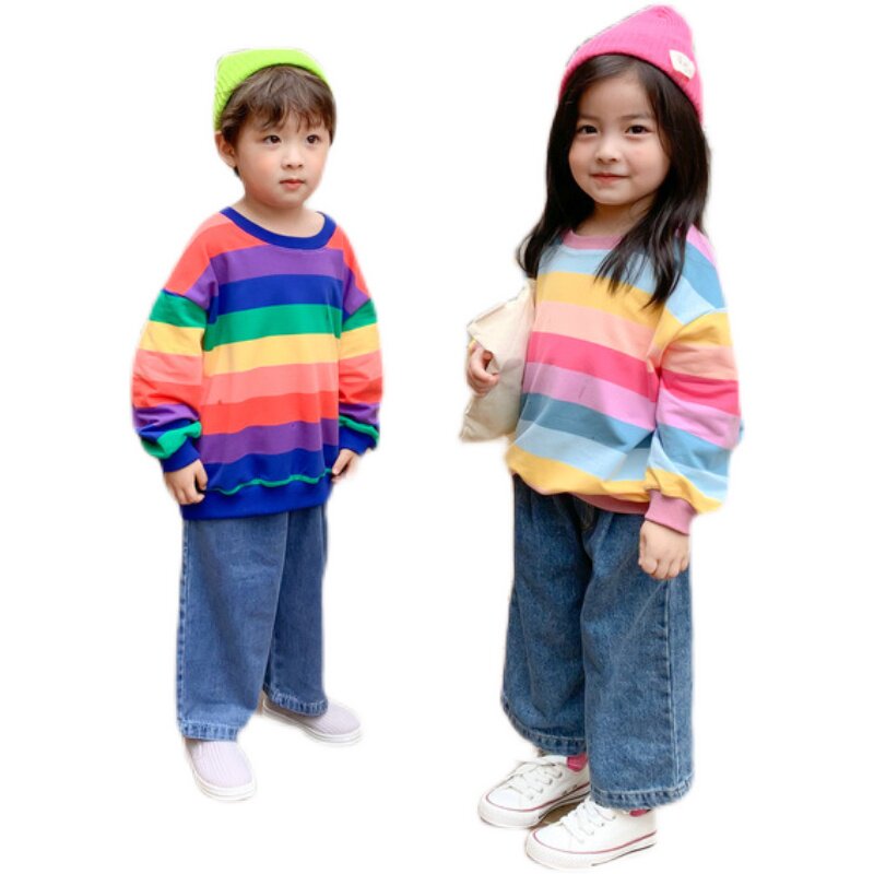 Children's Rainbow Strip Ware 2023 new boy and girl's air - loose sweater and sister clothing