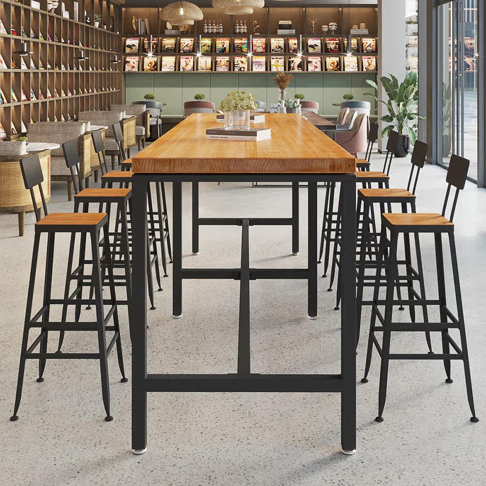 Strip Bar Table Iron Art Solid Wood Rectangular Table Commercial Café Egg bakery High foot table and chairs Composition 1216