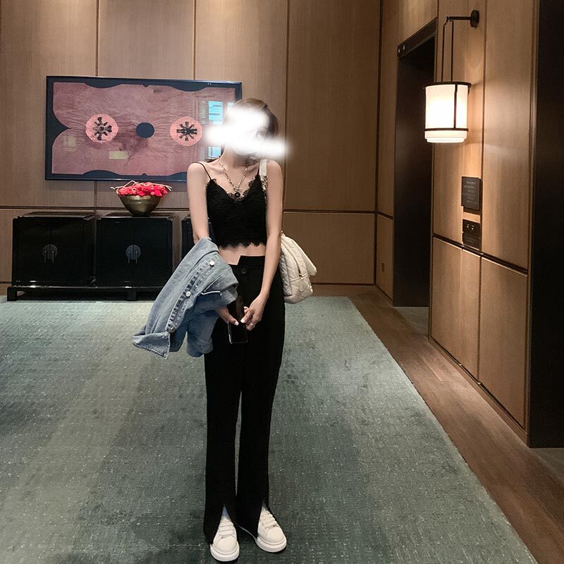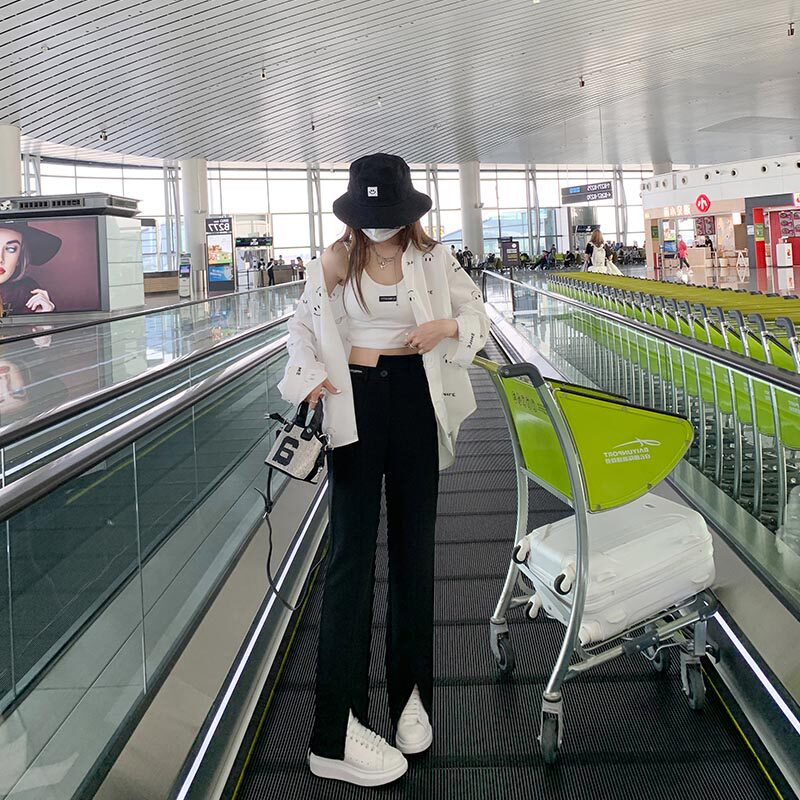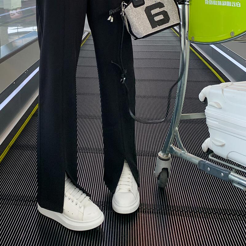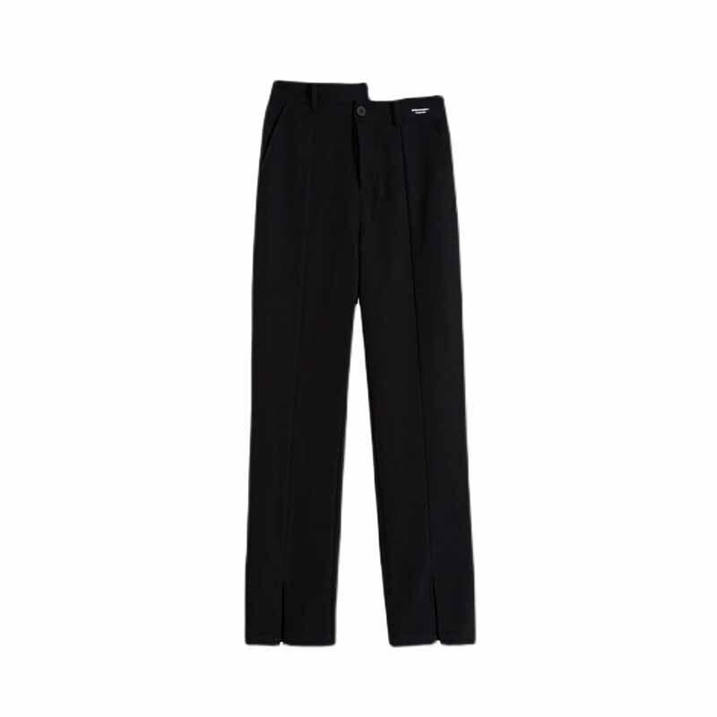 Pear-shaped stature large size size female clothing opening fork Western dress pants female Summer Fat younger sister Straight tube slim fit slim mm black wide pants
