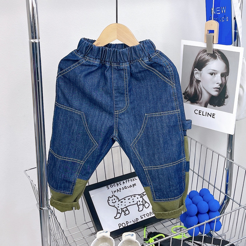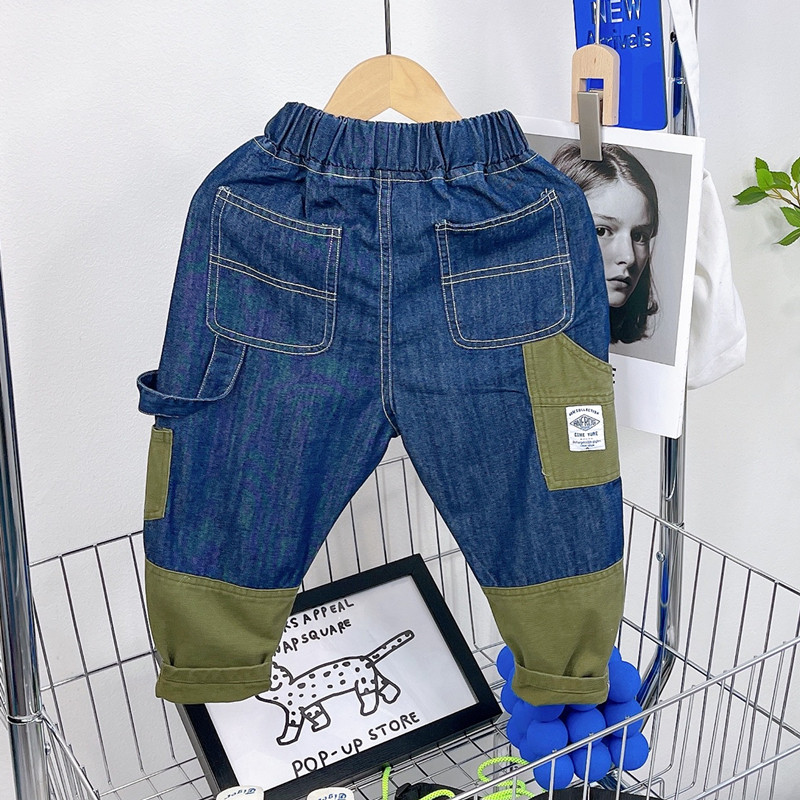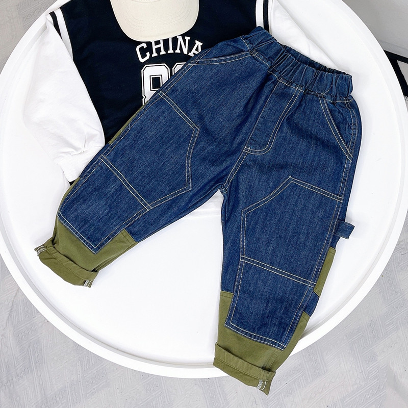 Day Ensemble Boy Collage Jeans 2022 Spring New Children Cool Handsome Casual Work Clothes Splicing Long Pants Tide