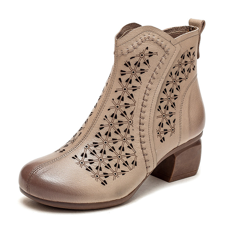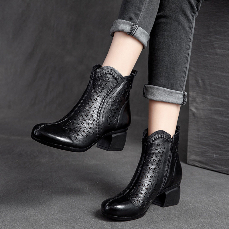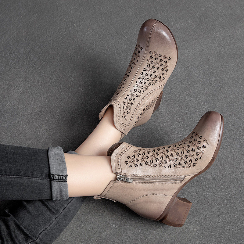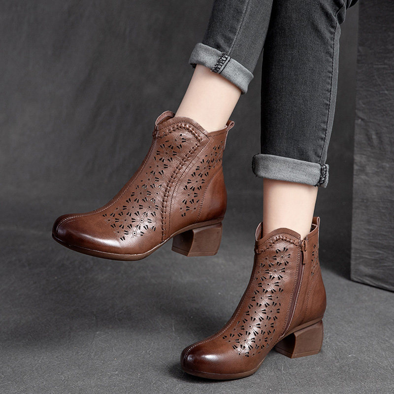 Spring new retro handmade genuine leather in heel sandals Coarse Heel Cave Shoes Hollowed-out Single Boots Breathable Mom Short Boots