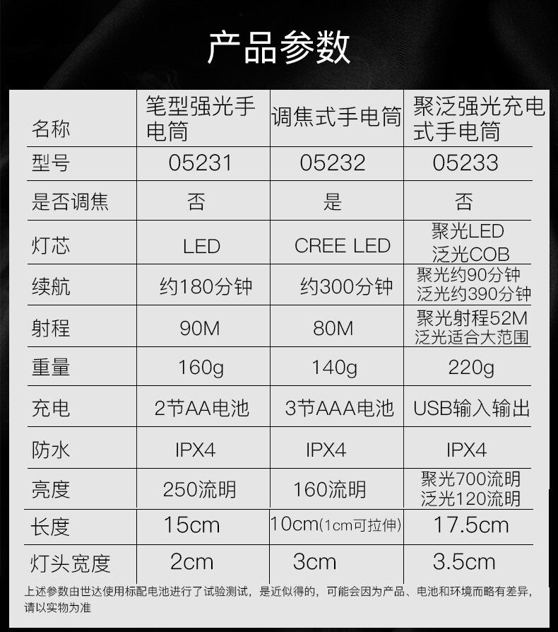 05231 (Pen Type Flashlight) 05232 (Focus Flashlight) 05233 (Rechargeable Flashlight)
