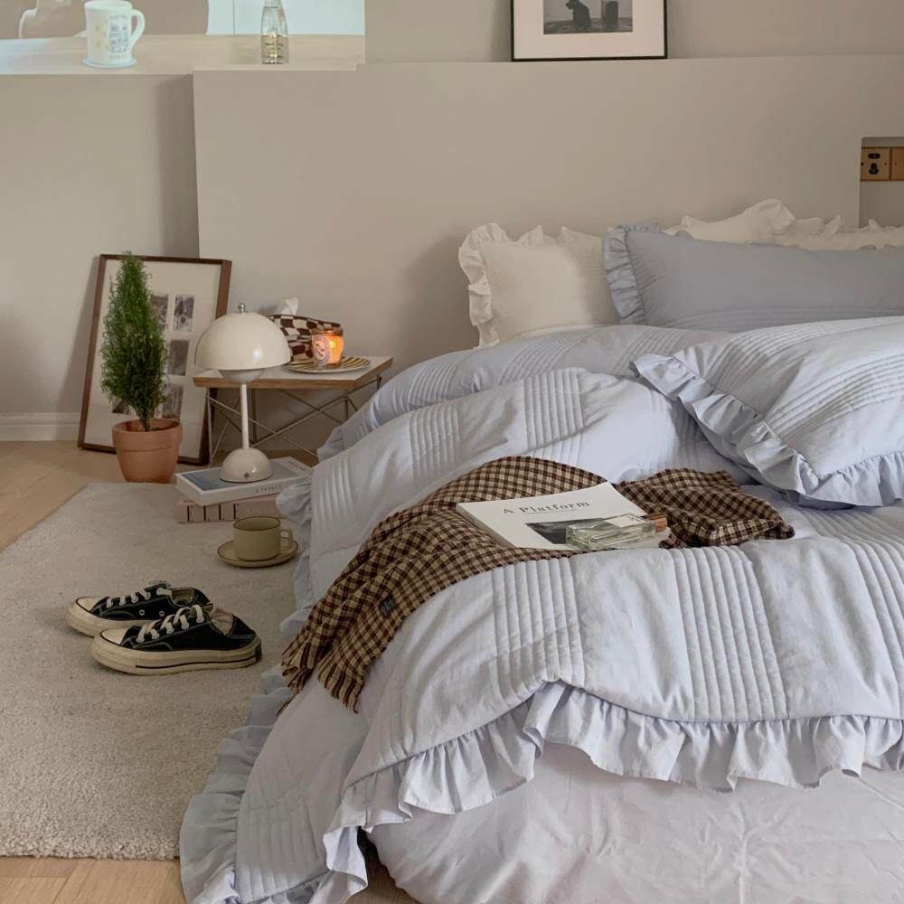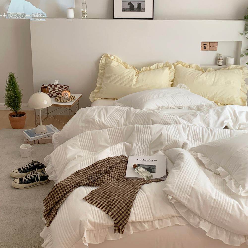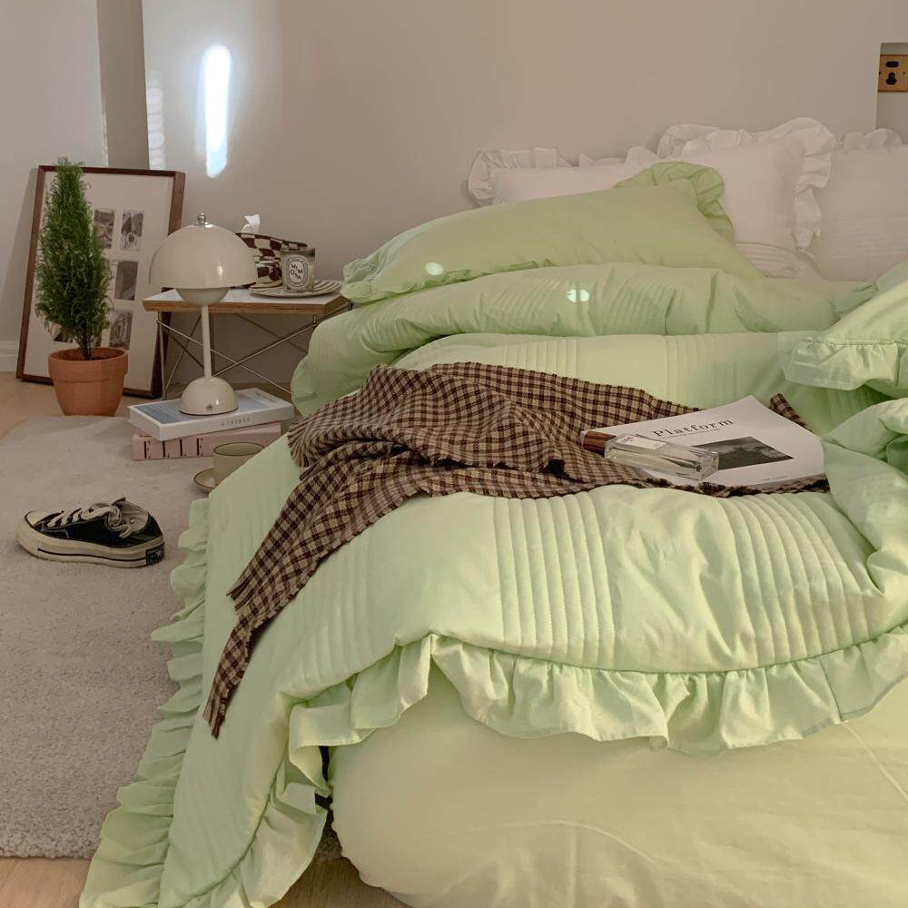 Sleep well ins Korean-style cotton four-piece set of solid color quilted quilted dual-use lotus leaf bed sheet quilt cover bed cover