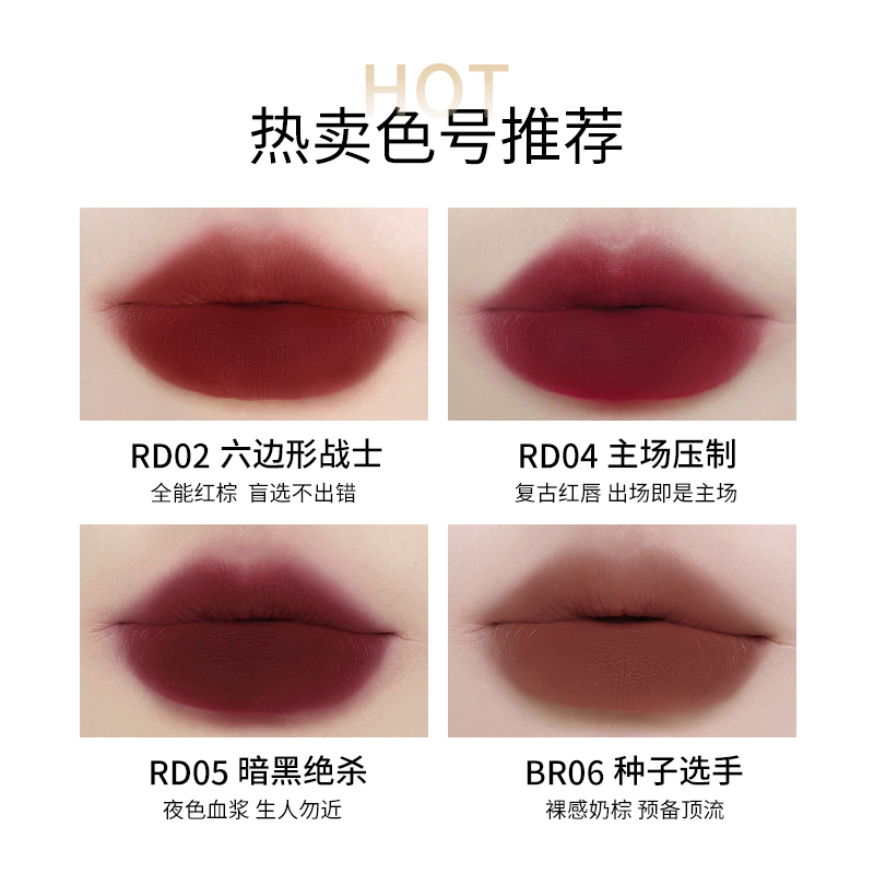RD04 home court suppresses retro red lips RD05 dark lore night plasma BR06 seed player nude milk brown RD02 hexagonal warrior all-round red brown RK07 childish group pet childish white