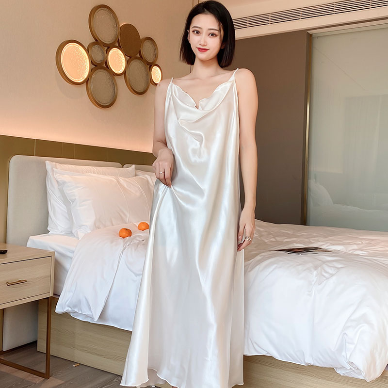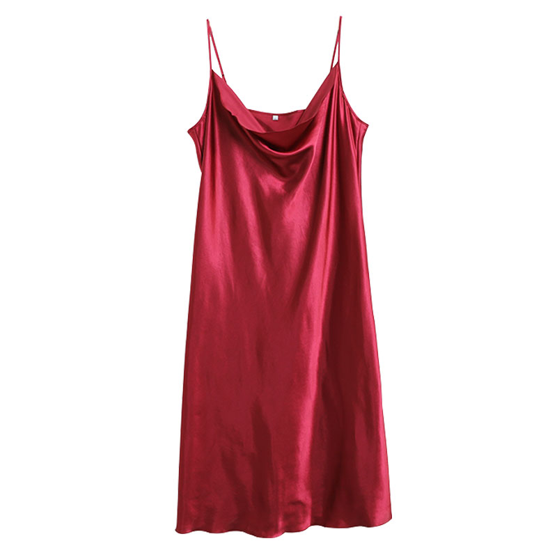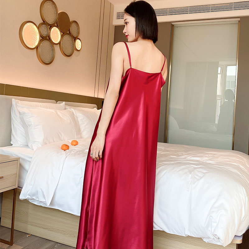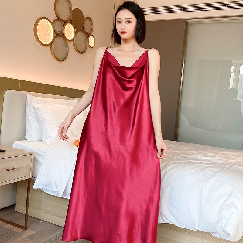 Silk large size sleeping dress 200 catty woman red hanging band dress with long version adjustable shoulder strap Summer ice silk home dress
