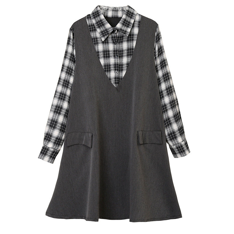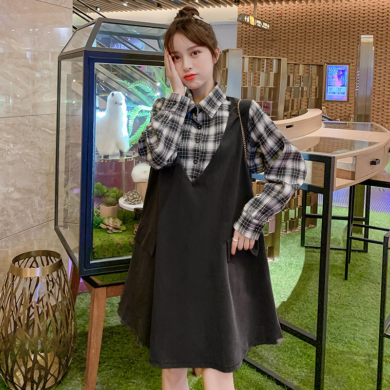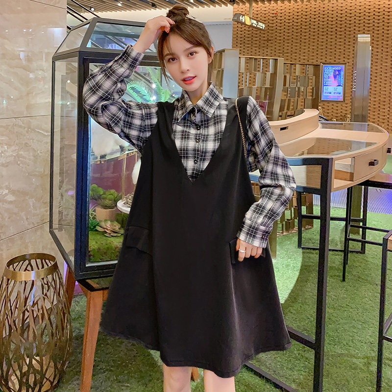 Pregnancy Woman Dress Spring Dress New Korean Version Of The Long Version Plaid Plaid Dress Large Size Loose and Thin Fake Two Skirt Suit