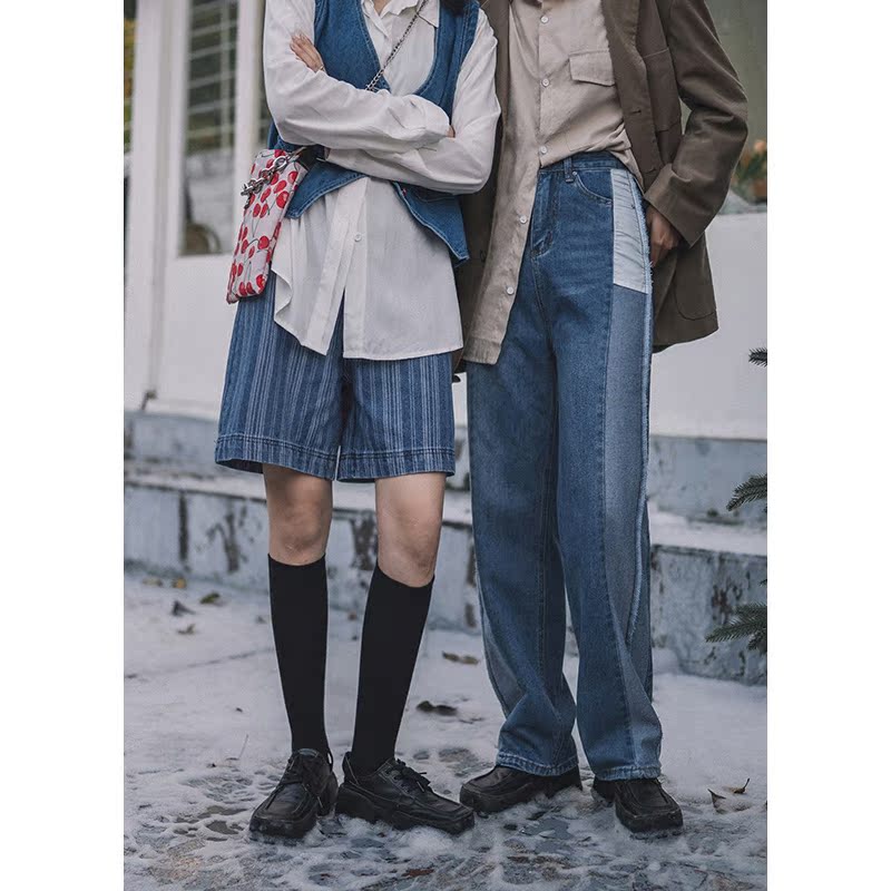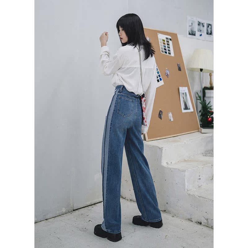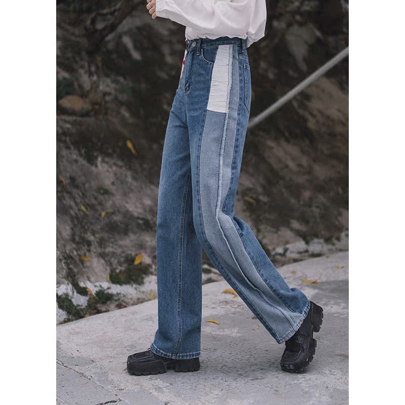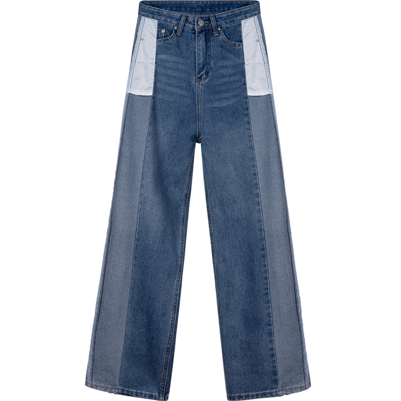 Design Sense Denim Straight Drum Pants Woman 2022 Retro small crowdhit Color splicing High waist loose casual wide leg long pants summer