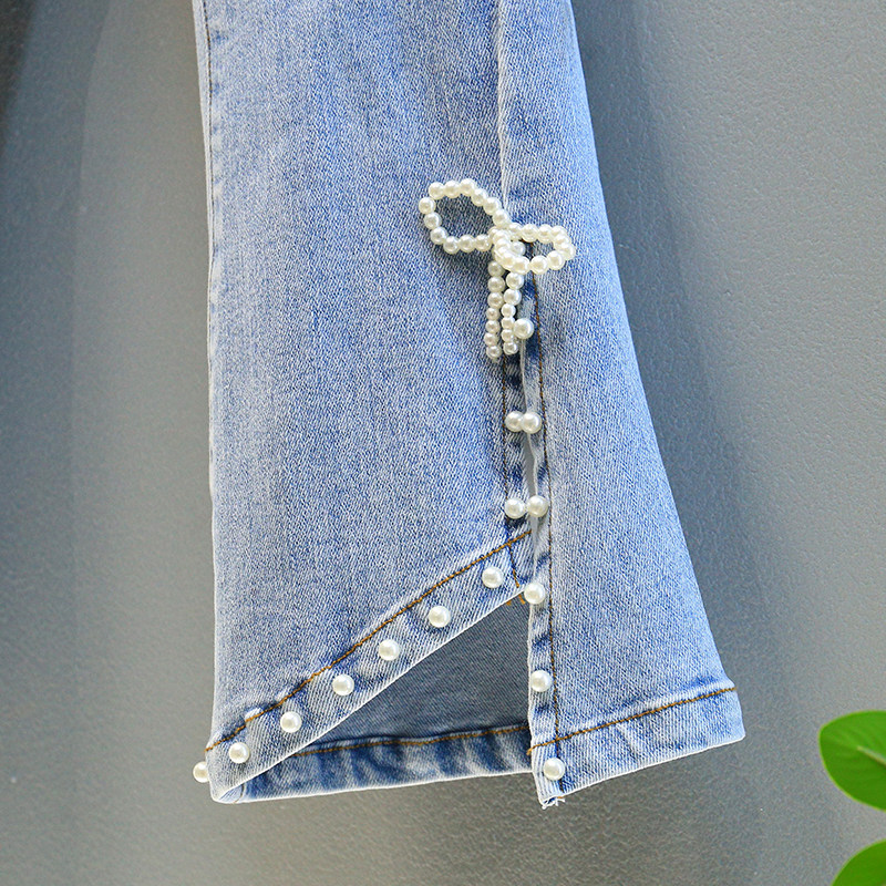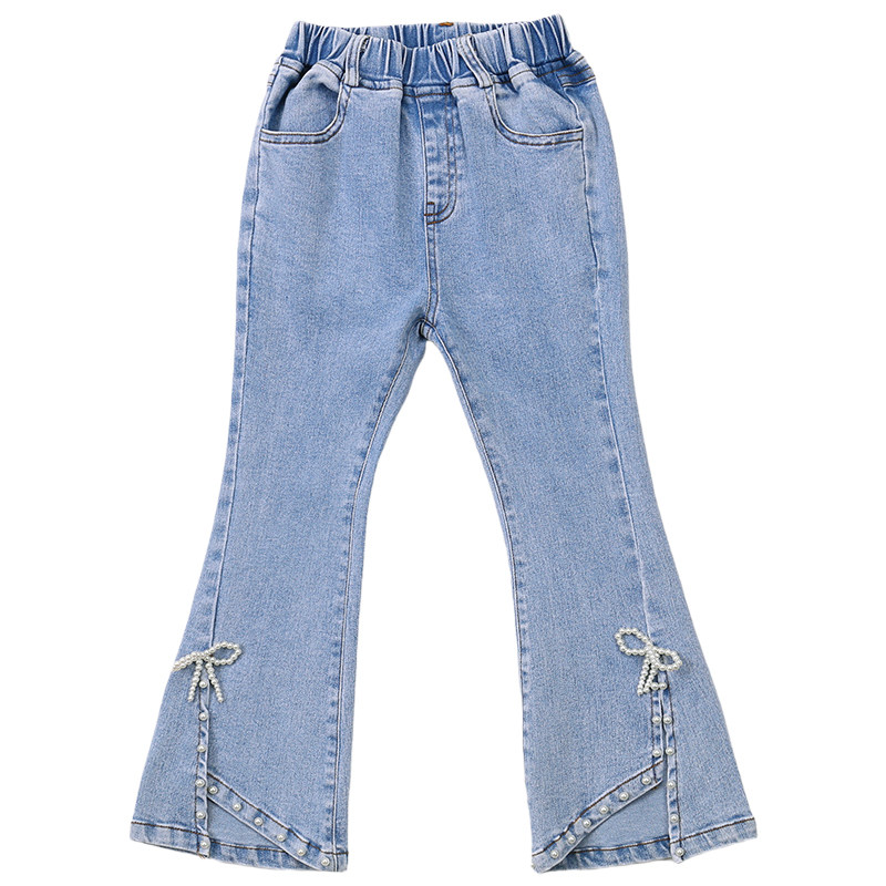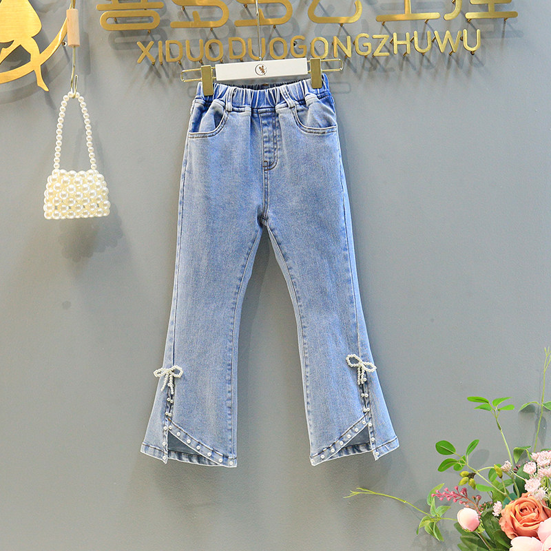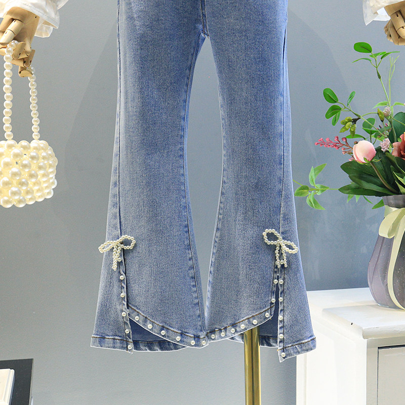 Girl Jeans 2022 Spring Autumn Dress New Korean Version Butterfly Knot Knitted Horn Pants Children Ladies Elastic Long Pants