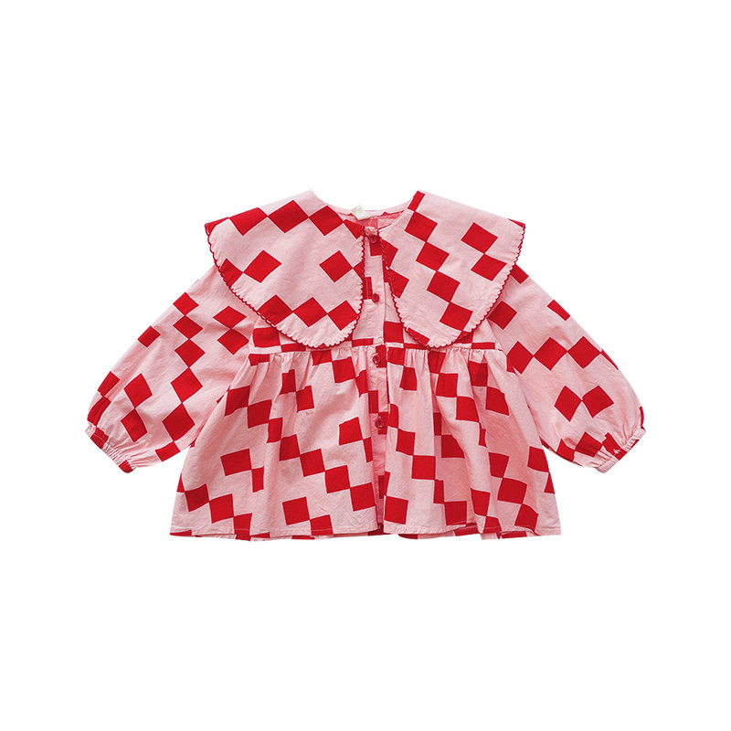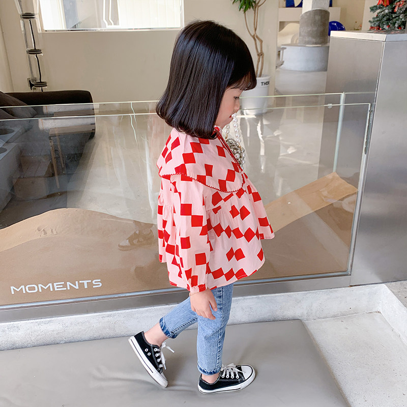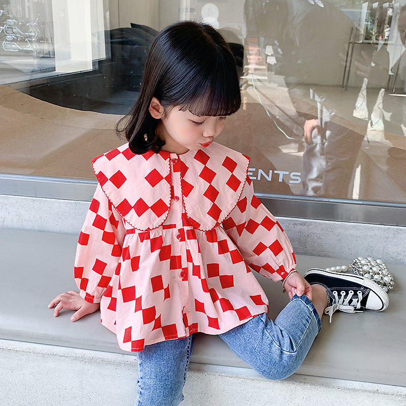 Girl Plaid Shirt 2022 New Spring Autumn Clothing Children's Net Red Polenta Blouse Women's Treasure Korean Version Dolls Collar Shirt