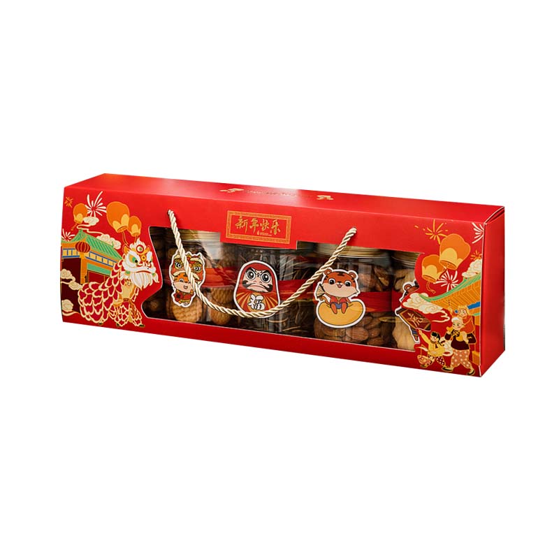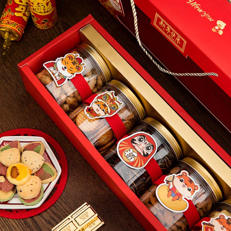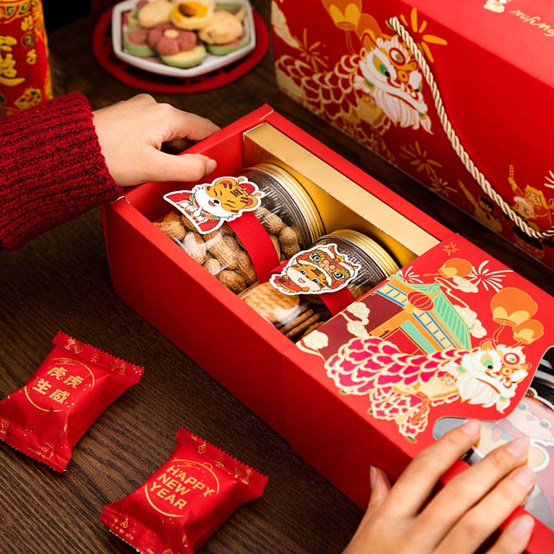 Golden silver color orange red pink red pink red dance lion Lunar New Year * 1 set of golden aluminum cover round biscuit jar * 6 silver aluminium cover round biscuit jar * 6 elastic with New Year elements * 20 Woke Lions Only