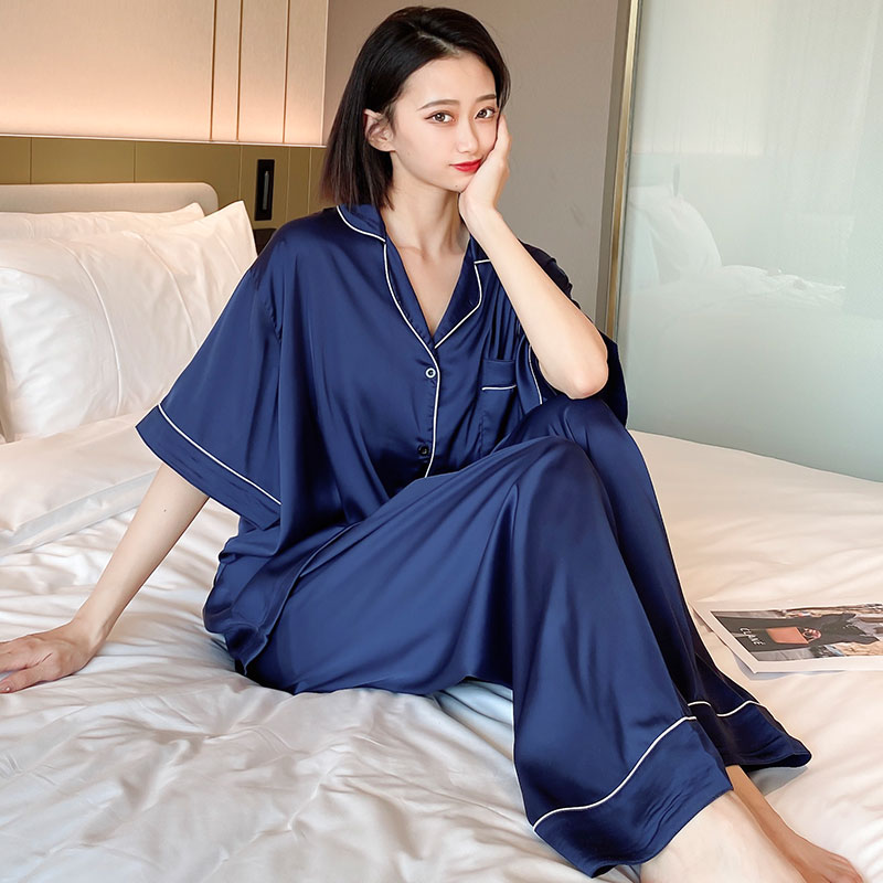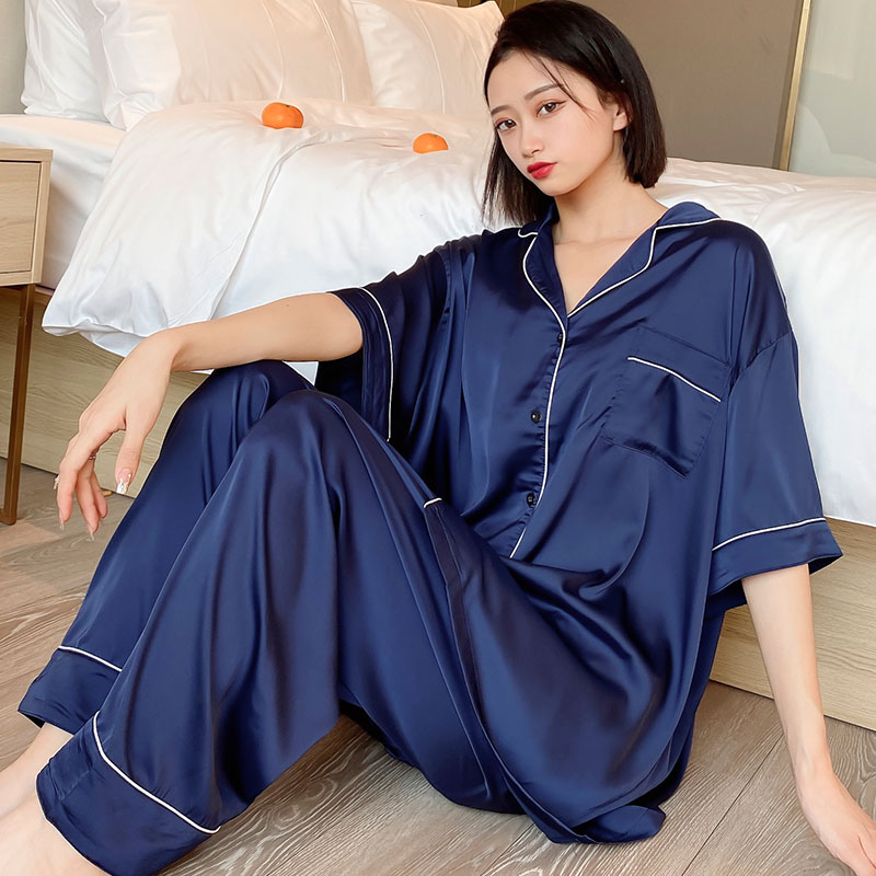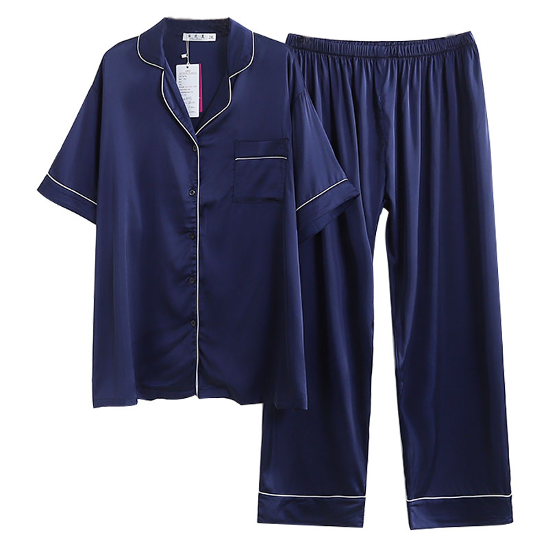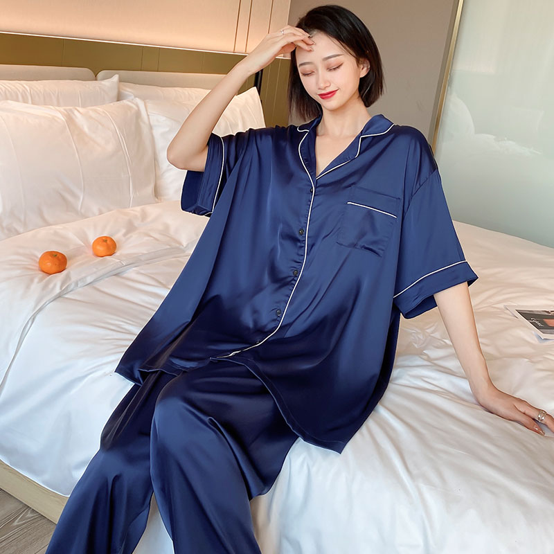 Ice silk large size pajamas women's spring and autumn thin short-sleeved trousers two-piece suit fat mm200 catties loose silk home service