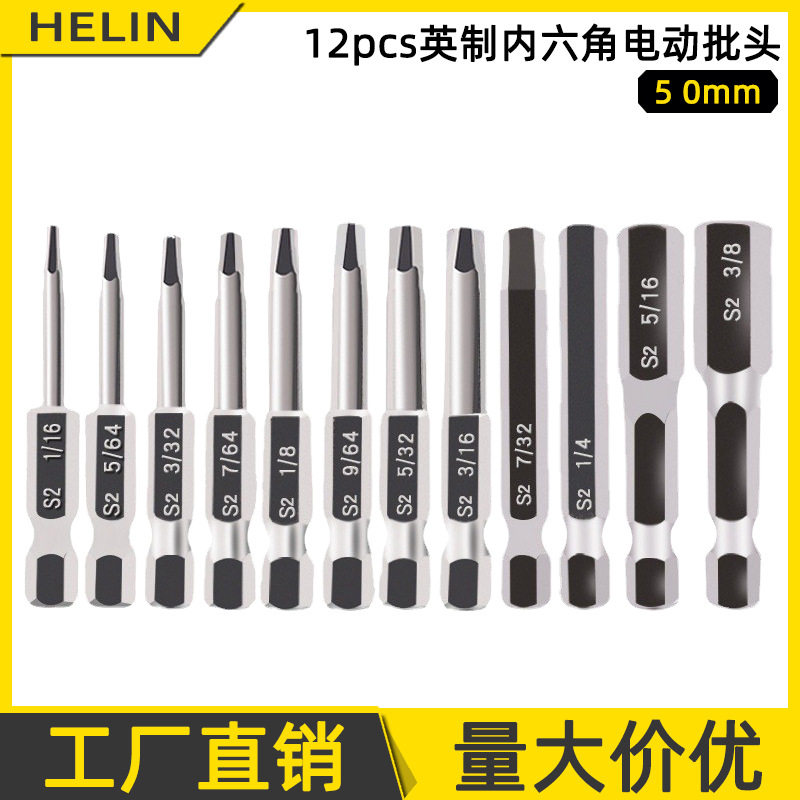 Cross border 12pcs English system of inner hexagon electric batch head screwdriver wrench suit 50mm strong magnetic electric drill batch head